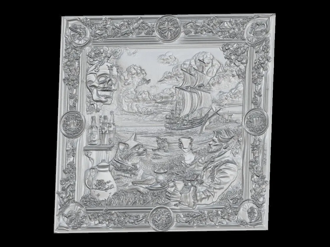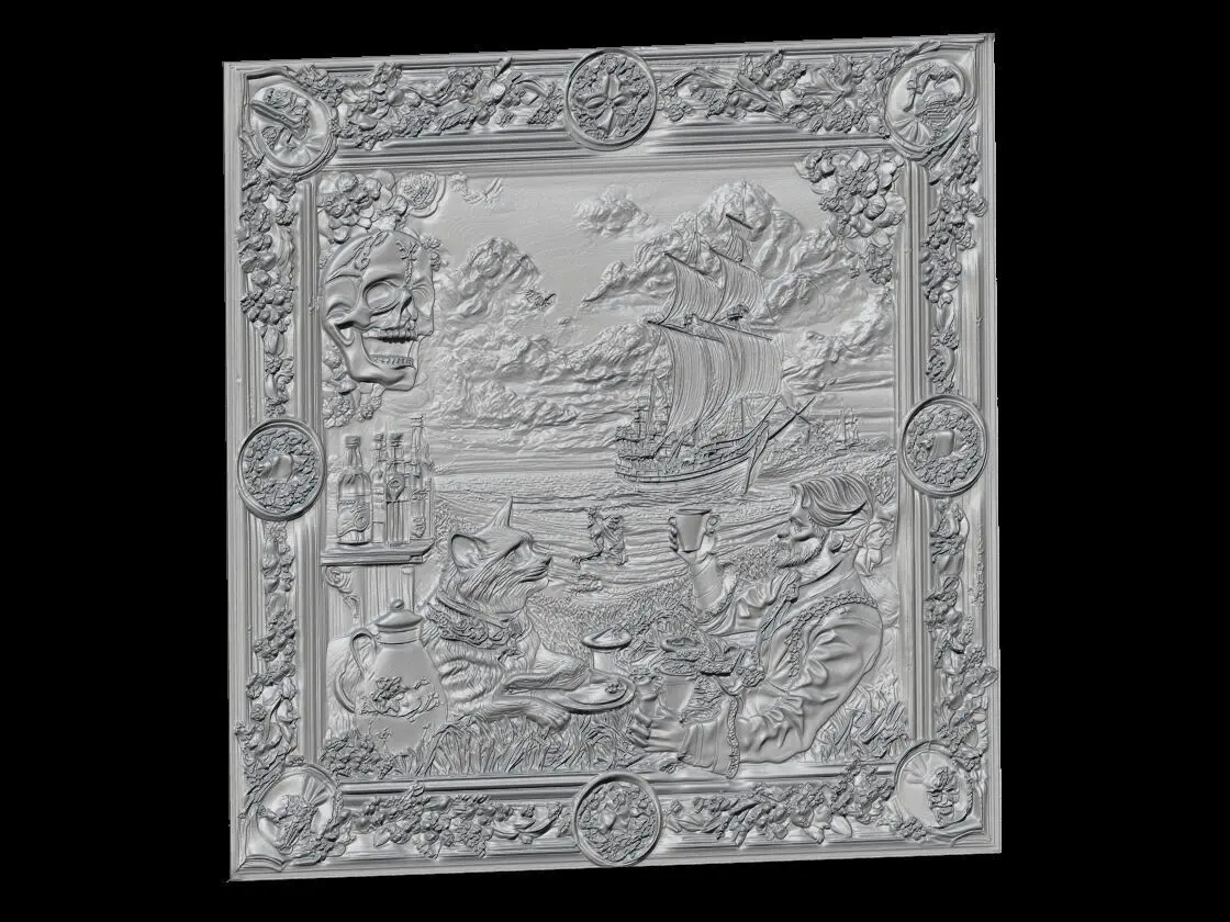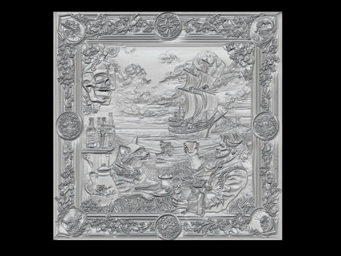 High-resolution 3D grayscale relief wall art showing a whimsical bar scene of a cat and a noble gentleman enjoying coffee by the seaside. The background features majestic sailing ships under dramatic clouds. The scene is framed by highly detailed floral elements, a skull, vintage bottles, a mask, and symbolic bar motifs. Ideal for CNC wood carving, laser engraving, 3D resin printing, and decorative wall panels.