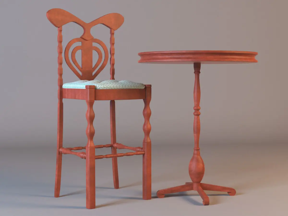 An ornate, wooden Counter Table and Bar Stool set. These models, seperately or together, can easily provide a classic/modernist look and feel to your arch/viz interior renders, or it could also work very nicely as character props.