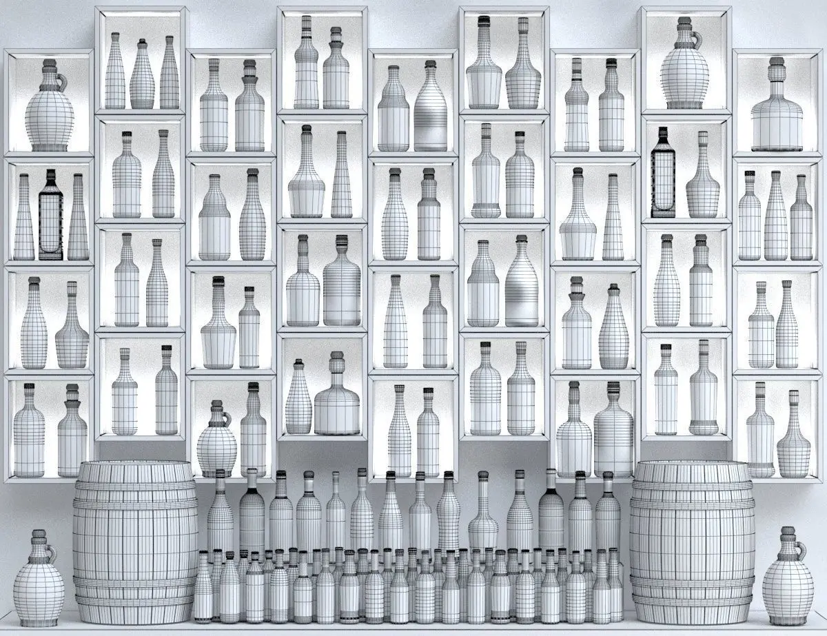 3d model - Fillings for a bar, an alcohol shop.The model of shelves with alcohol and bar countertops has more than 70 unique bottles, wines, whiskey, beer and other beverages. There are two instanced duplicated wine barrels with a brand stencil on them.