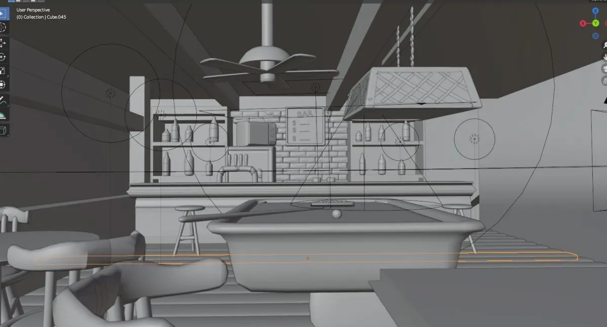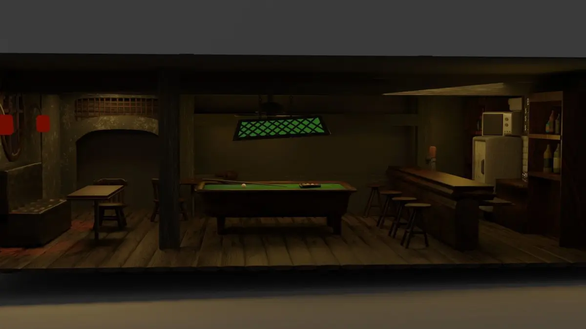 It has only inside part of the bar there is no door or entrence that is why there is black wall behind that bar. it has pool table with bar chairs and all other little details that all bar has no textures needed, every materials was made in shaders.