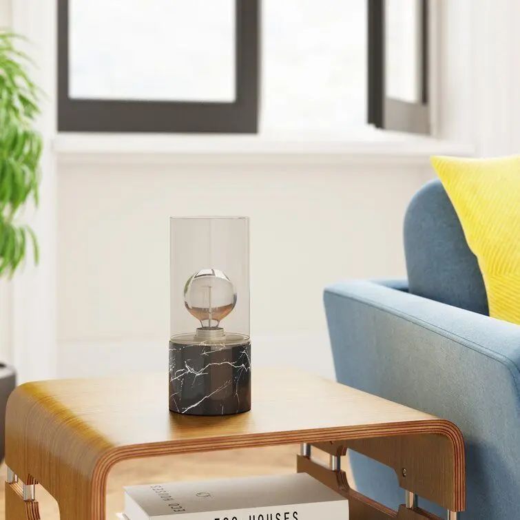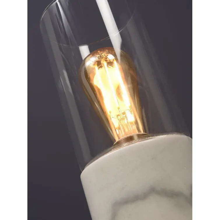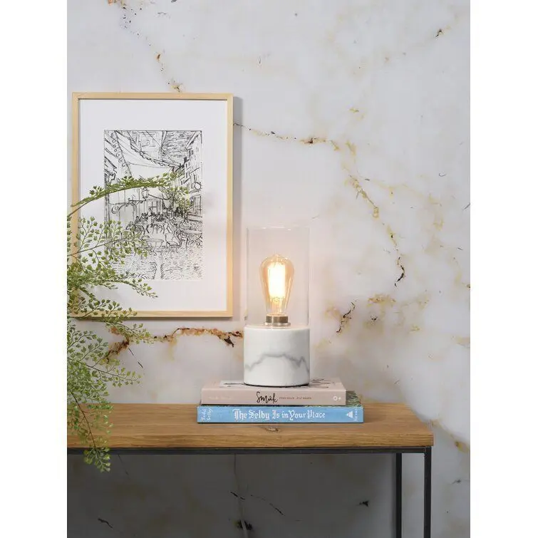 - Its straight cut glass cylindrical rod offers tall sleek lines and delicate curves in an industrial clear-cut glass. Whilst the luxuriously crafted black marble base is made in a timeless flecked white matt pattern to add further depth to the piece. This seamless fusion of styles easily compliments a wide range of settings from bedside tables to home office centrepieces. Naturally free up your tabletops and counters with this Barasinga 25cm Table Lamp, which boosts up to 40 Watts of rich ambient light from any angle. A stunning display piece whether on or off, made for contemporary and couture living.