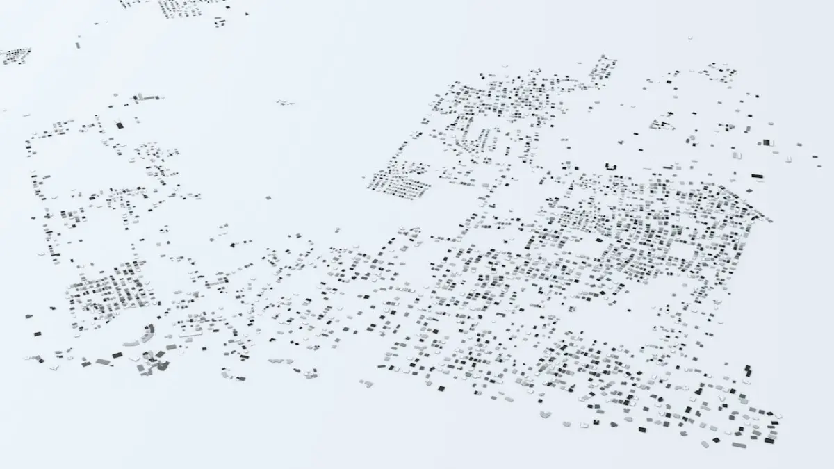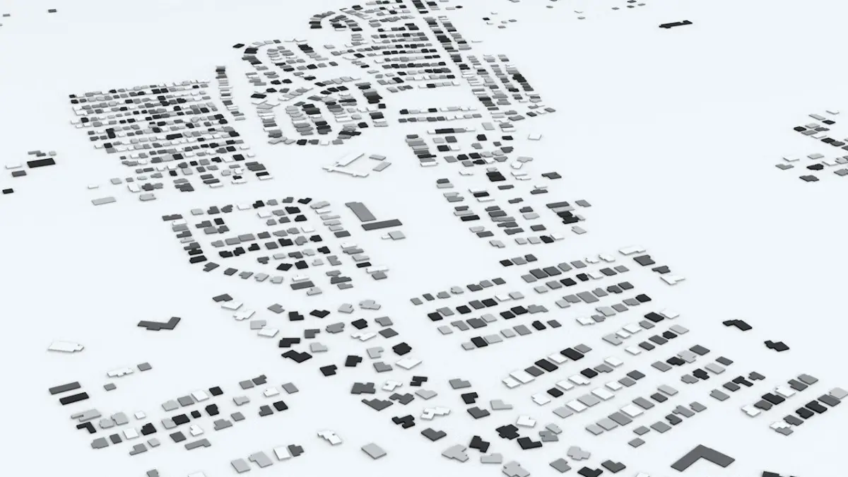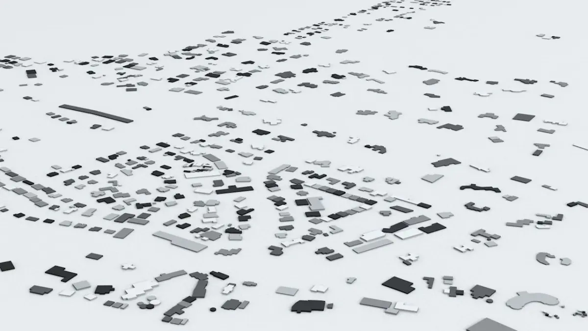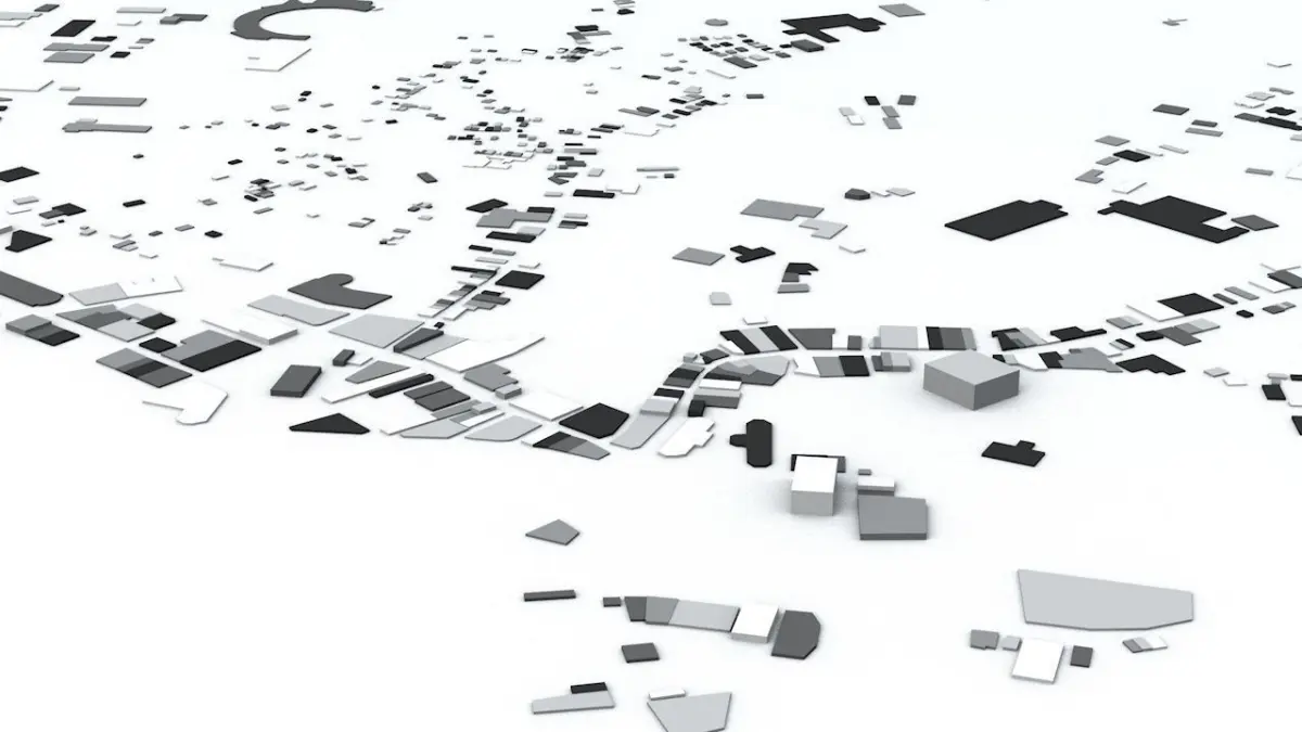 - the model is positioned on a flat surface (all buildings are on the “floor” - no elevation data included)