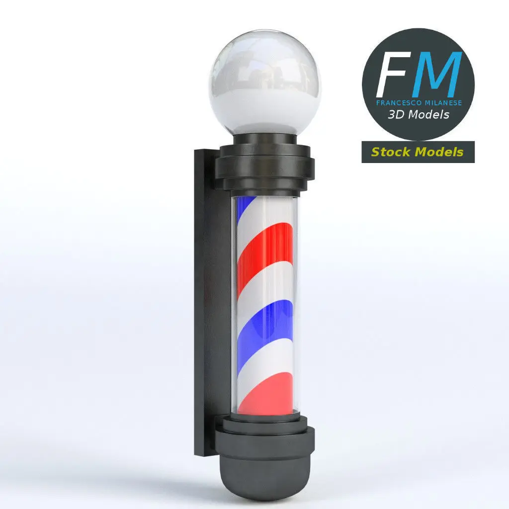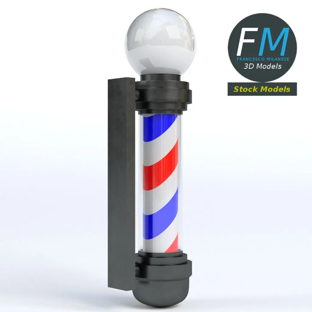Barber pole 3D Model. 4 objects (frame, glass, lamp inside, rotating pole), each one with its own non overlapping UV Layout map, Material and PBR Textures set. Production-ready 3D Model, with PBR materials, textures, non overlapping UV Layout map provided in the package. Production-ready 3D Model, with PBR materials, textures, non overlapping UV Layout map provided in the package.