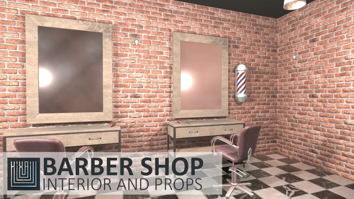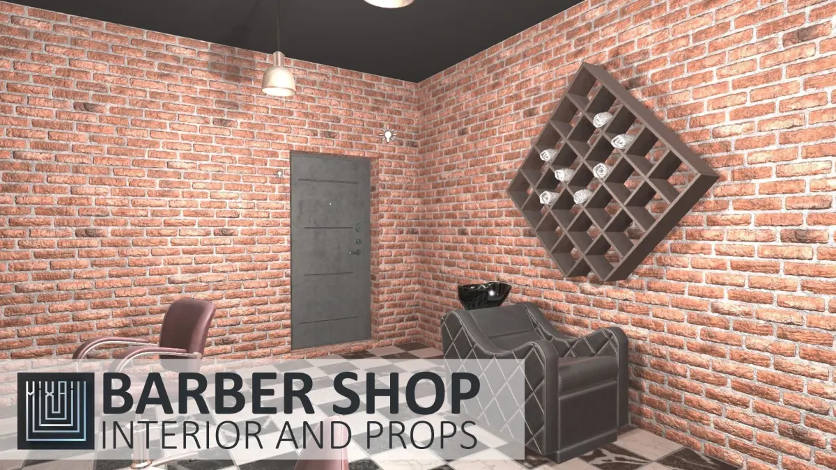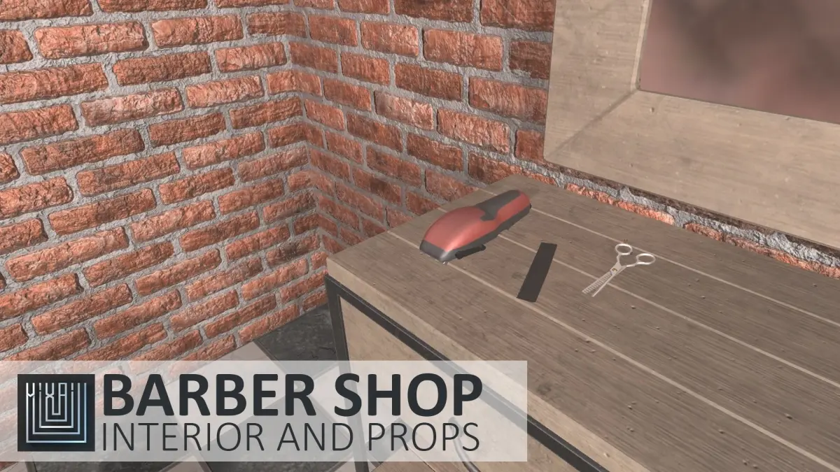 Mixaill studio presents a good solution for your games, VR projects and simulators.Barber shop - interior and props is a room with equipment, furniture, interior items that will help you save time on implementing your ideas.Pack includes a large set of necessary models:roomdoorbarber's chairtable with mirrorBarber’s Polehair clipperhairdresser's scisorscombhead sinka shelf with a towellamp