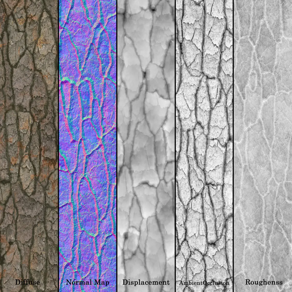 Base color PNG 8 bitNormal Map PNG 8 bitRoughness PNG 8 bitAmbient occlusion PNG 8 bitDisplacement PNG 16 bit