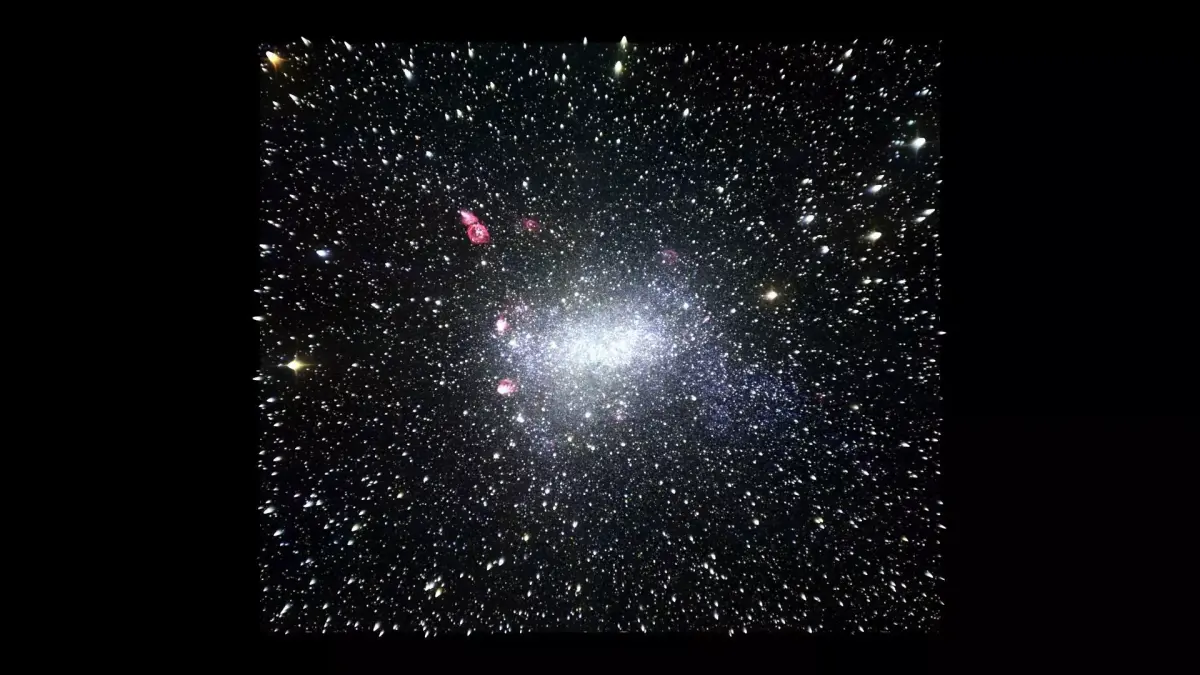 DescriptionBarnard's galaxy (also known as NGC 6822, IC 4895, or Caldwell 57) is an irregular barred spiral galaxy. It is about 1.6 million light-years away, in the constellation Sagittarius. The galaxy is part of the Local Group of galaxies. It was discovered by E.E. Barnard in 1884 with a six-inch refractor telescope. The galaxy is one of the closest to the Milky Way. It is similar in structure and makeup to the Small Magellanic Cloud. It is about 7,000 light-years in diameter. The galaxy is famous because it is where cepheid variables were used to find out how far away the galaxy was. Edwin Hubble found 11 cepheid variable stars, and used them to find the distance to the galaxy. This settled a great debate in the 1920s about the scale of the universe and the nature of spiral galaxies. It became clear that all spiral nebulae were in fact spiral galaxies. They are far outside our own Milky Way.