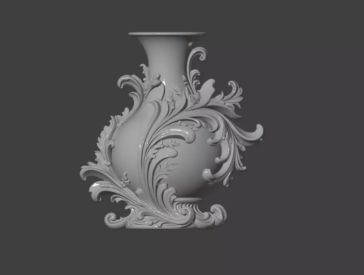 This vase features Baroque style design with ornate acanthus scrolls and leaf reliefs, presenting classical European aesthetics. The surface is covered with flowing curved decorations extending from the base to the rim, forming a richly layered three-dimensional form. Gold trim contrasts with white porcelain finish, adding luxurious appeal.
