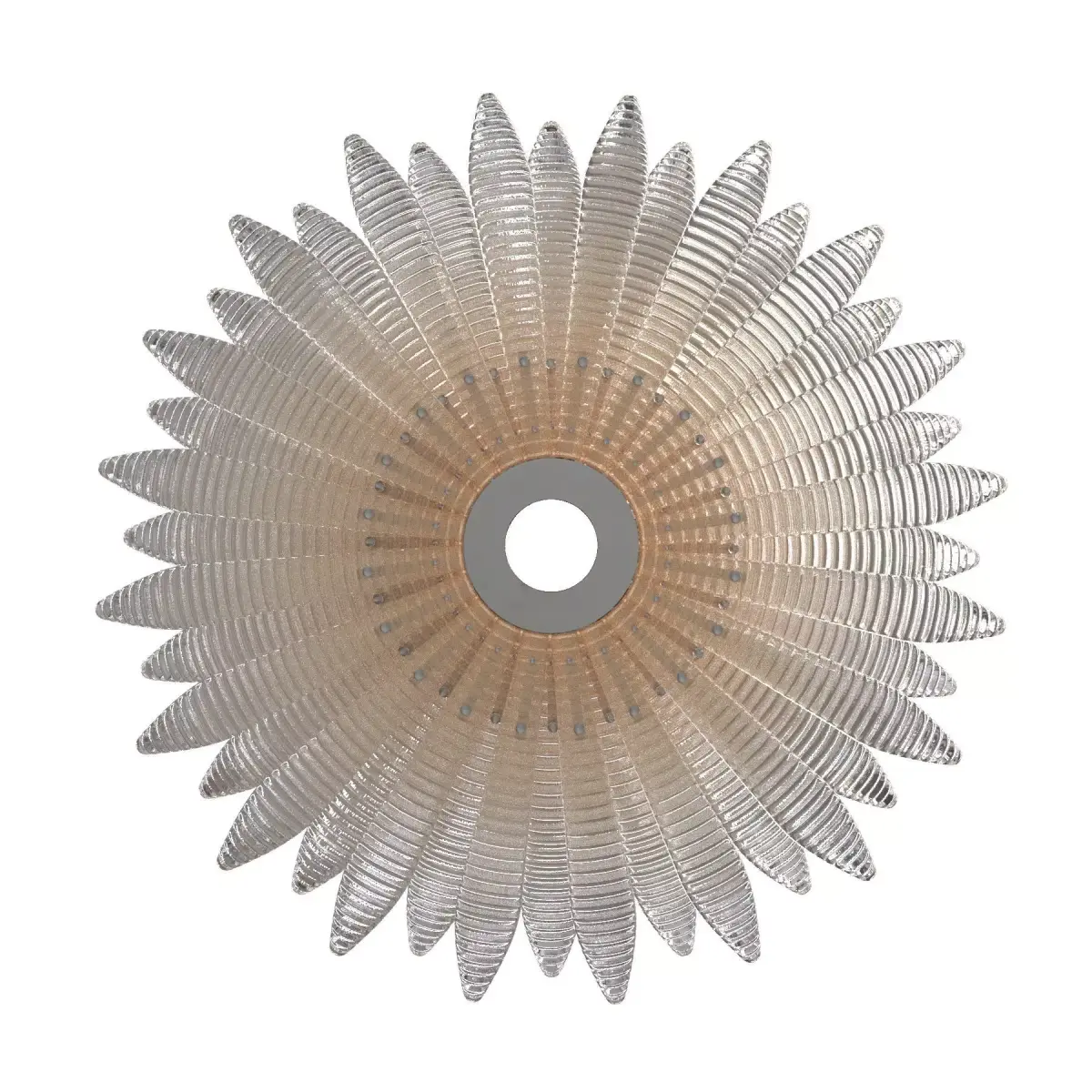 Agave is a collection inspired by the plant of the same name, a symbol of elegance and resilience, reinterpreted in Venetian crystal by designers García Cumini. Its iconic elongated leaf recalls Barovier&Toso’s glassmaking tradition and is enriched by the dew technique, which enhances its brilliance and three-dimensional texture. An innovative shaded effect, obtained with coloured glass beads, further enhances the design. This workmanship diffuses light dynamically, evoking the sun’s rays filtered through the agave leaves.size90x90x100cm H