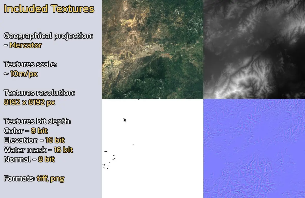 Warning: minor clouds/artifacts may be present on the diffuse color satellite texture due to the nature of the dataset. Check product images.