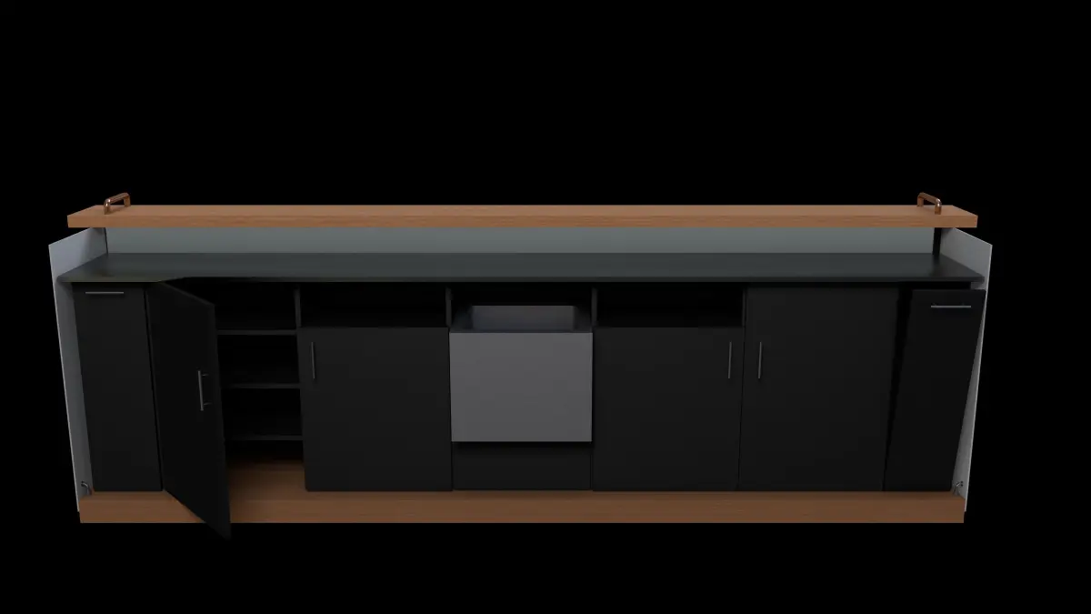 barra de bar amueblada con espacio para exhibicion, logo en el back y en el frente de la barra, con madera y vidrio, metal perforado en el fondo y luces LED en la prede del fondo. Diseño moderno e industrial.los objetos se encuentran separados en obj para poder usarlos en el sofware de tu preferencia