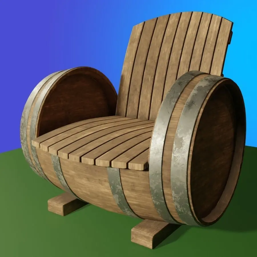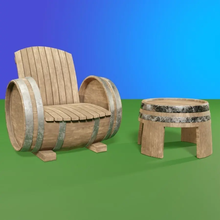 Patio and Lawn furniture made from old wooden barrels.One chair and one table as separate objects.PBR textures.Rendered in Blender Cycles.
