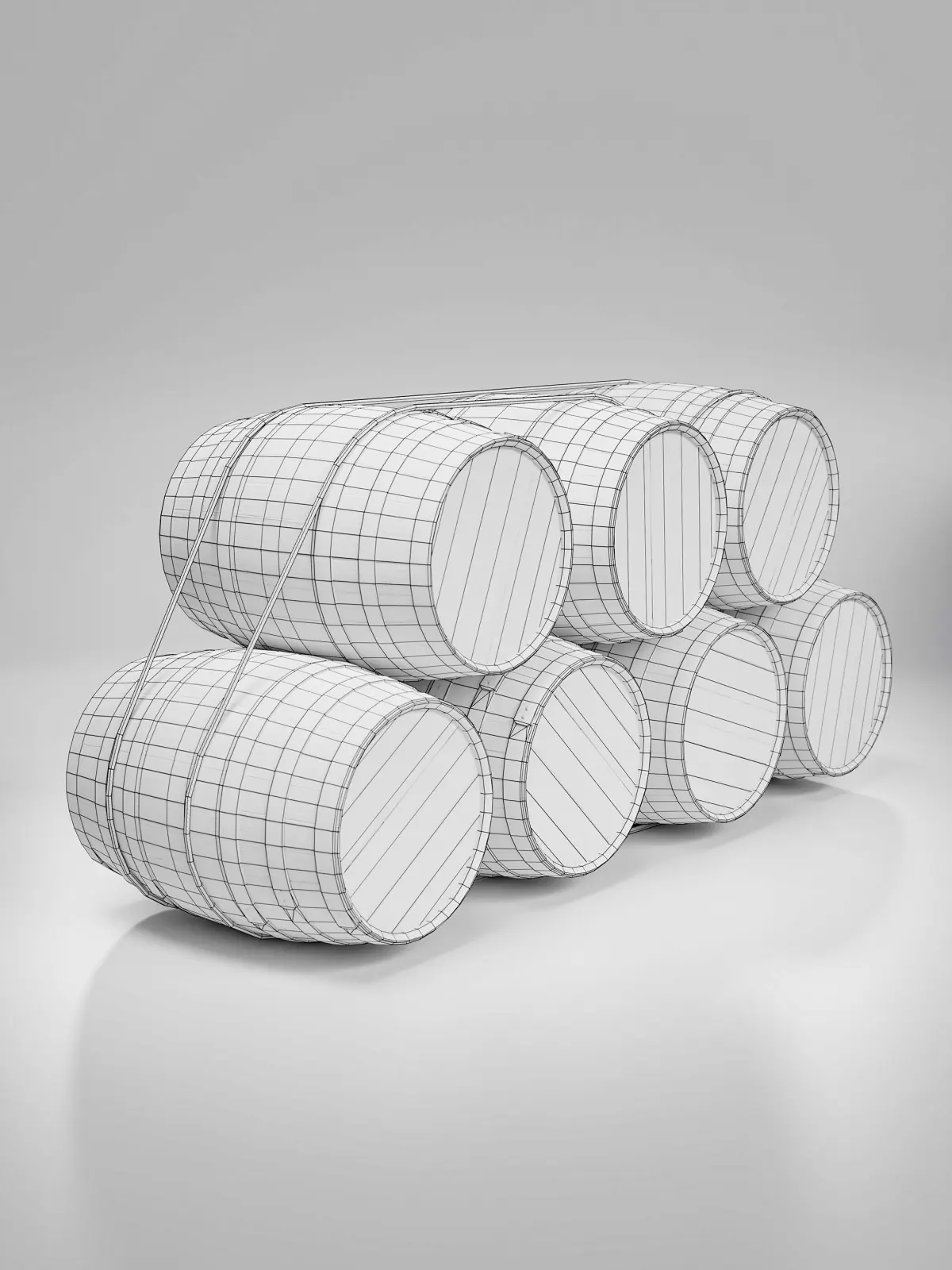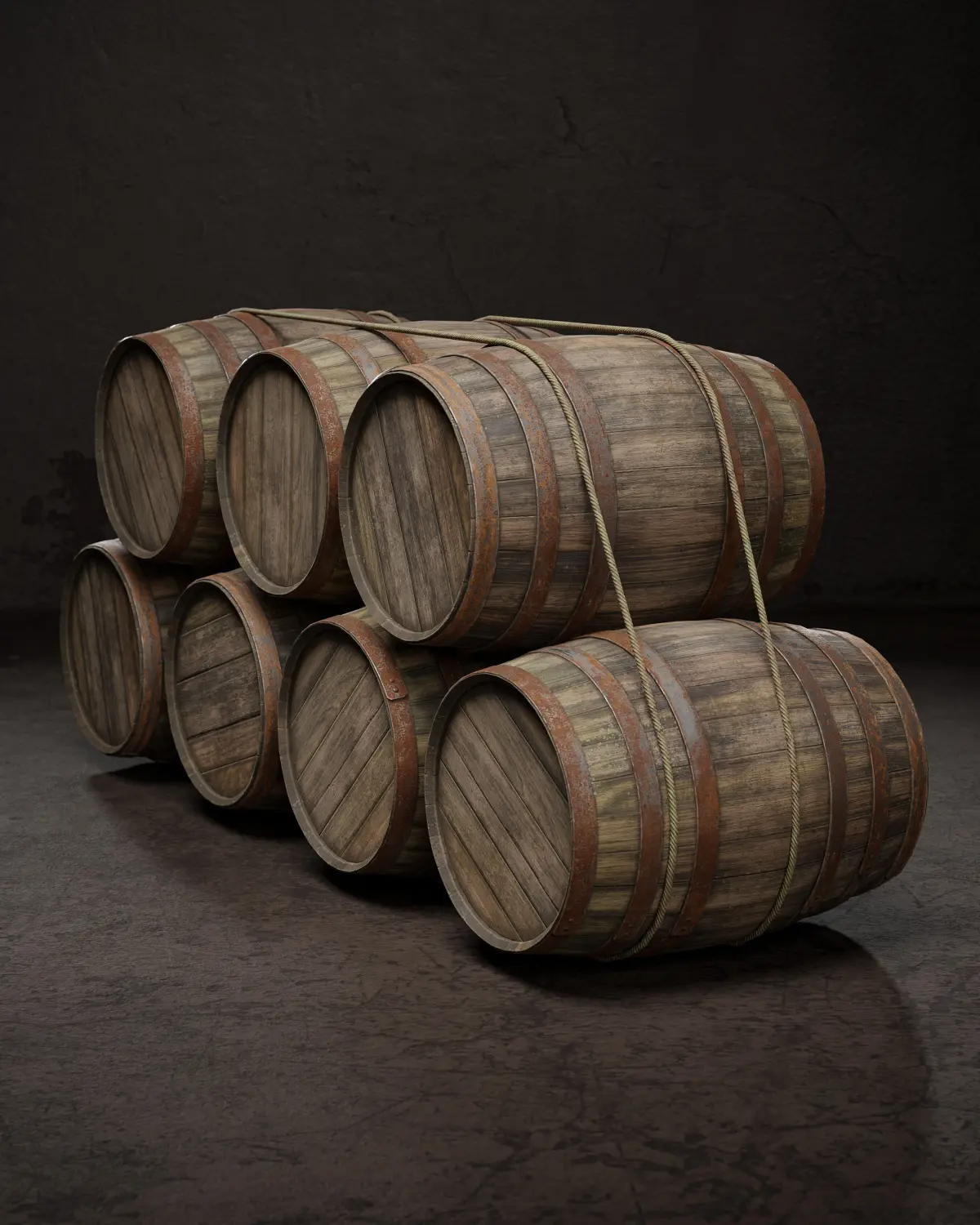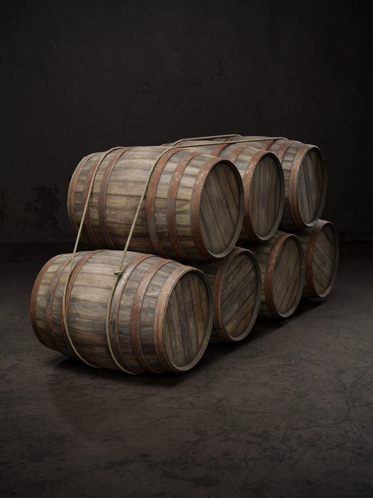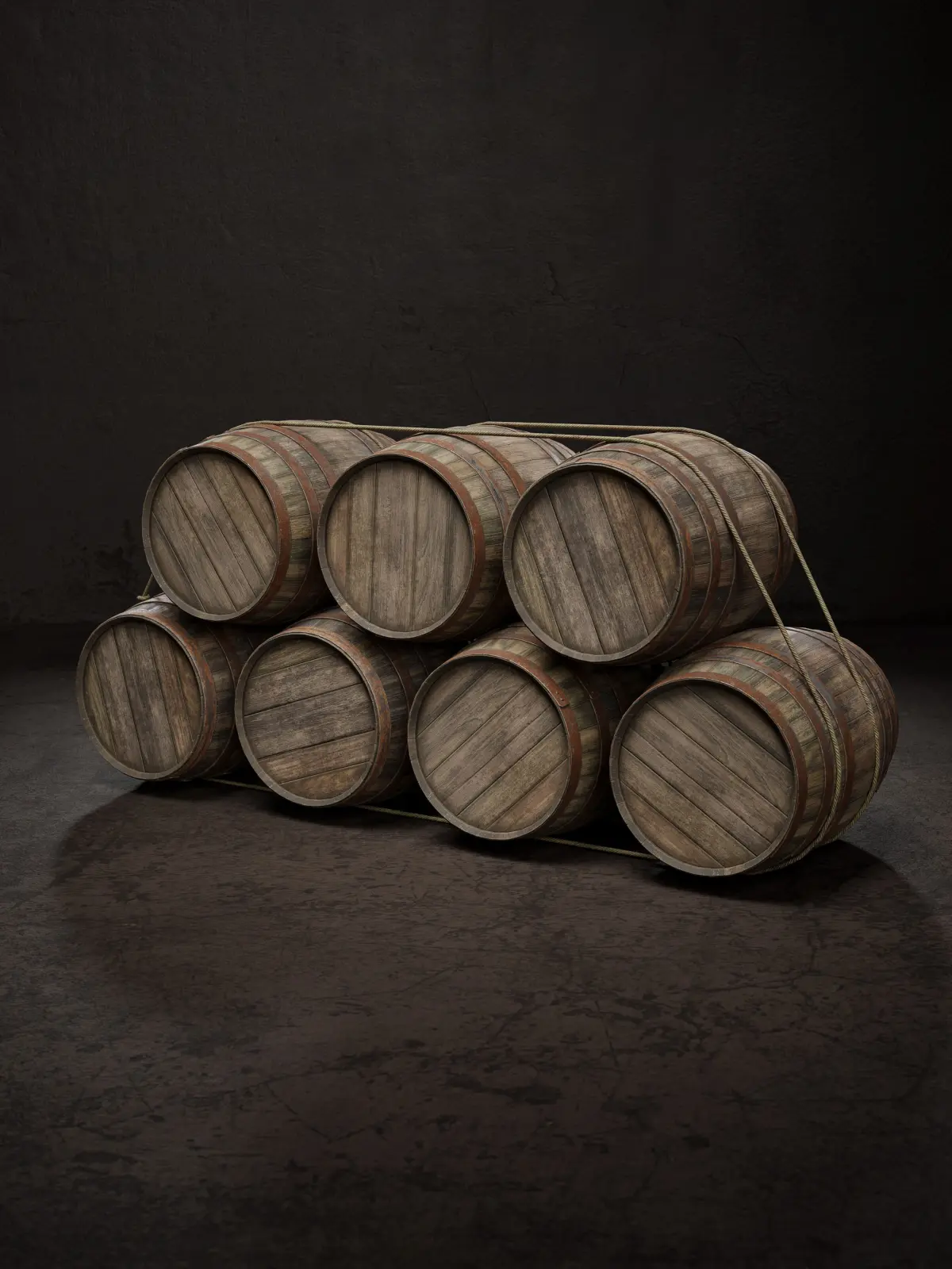 Low poly game-ready model of a stack of seven old wooden barrels, tied with rope.