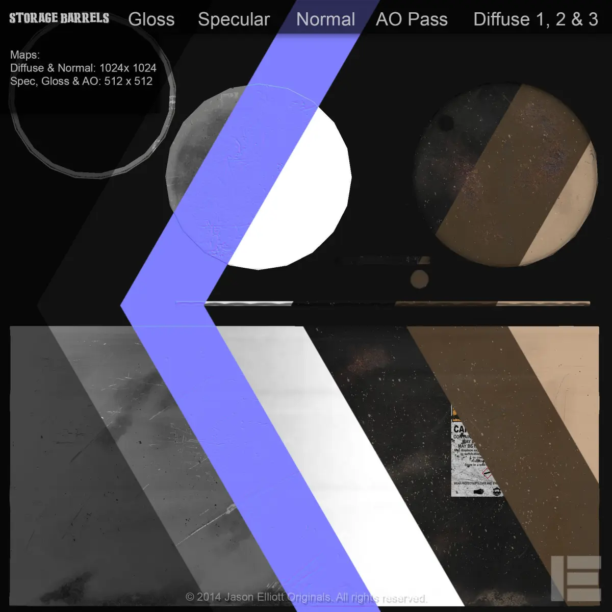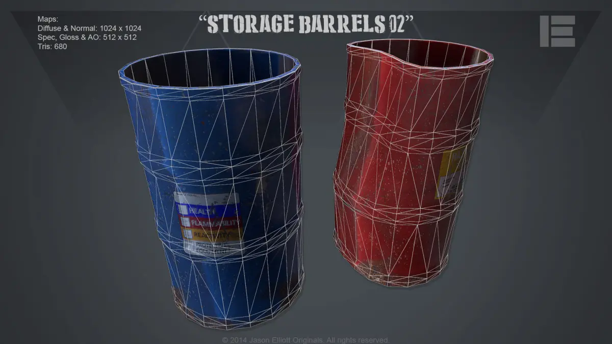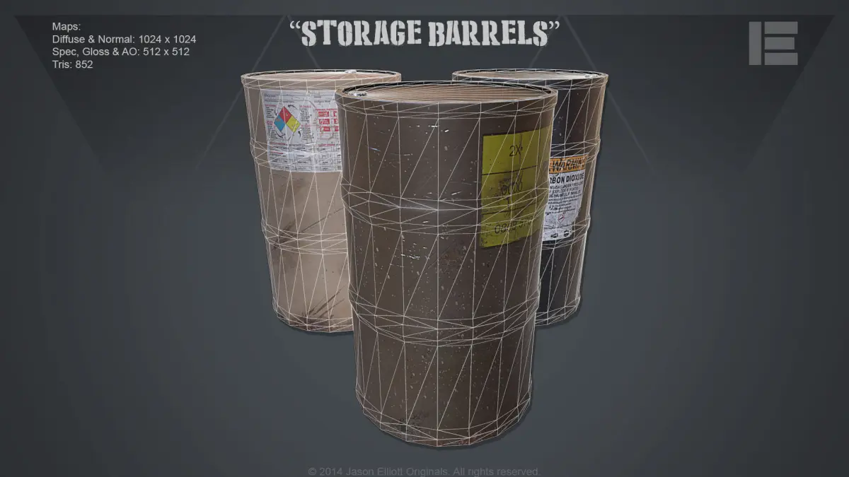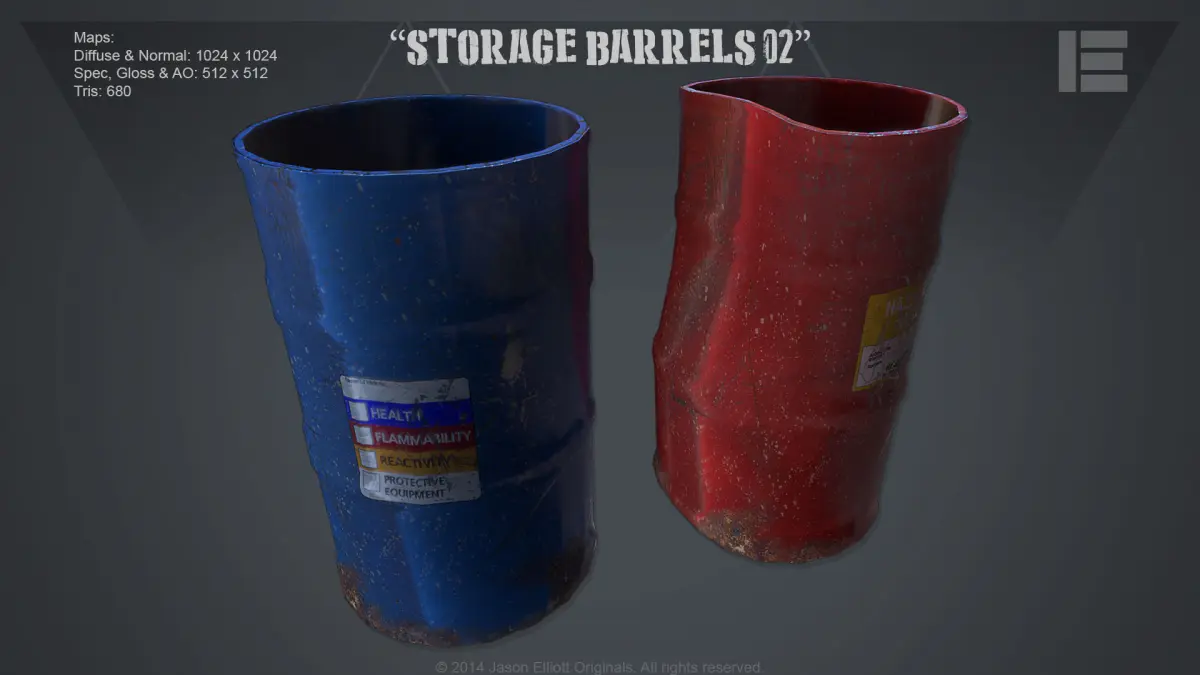 These are three very basic worn industrial barrels that are game ready. These are UV mapped with clean geometry and are ready for LOD creation. Each barrel has a Specular, Normal, Ambient Occlusion and multiple Diffuse maps. Each map is rendered in the following comes in the following sizes: 2048x2048, 1024x1024, 512x512, 256x256.The specs of each barrel and its maps are as follows:Barrel 001 Barrel 002 Barrel 003Tris: 680 Tris: 852 Tris: 680Verts: 342 Verts: 428 Vertss: 342