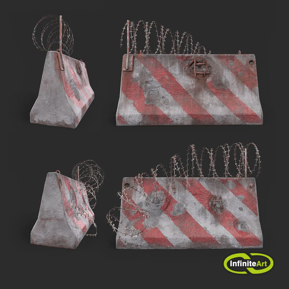 Concrete block with barbed wire - can be used as a protective structure (or defensive). We present four types of block damage and different barbed wire locations: roadblock_1, roadblock_2, roadblock_3-, roadblock_4.
