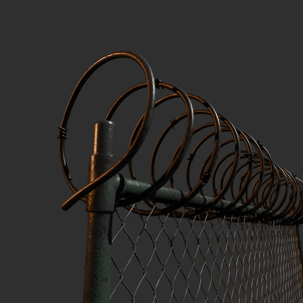 A high-quality PBR concrete barrier with a realistic chain-link fence and barbed wire, perfect for game environments, architectural visualization, and simulation projects. This detailed, high-poly asset features 4K textures, realistic wear and tear, and optimized UV mapping for seamless integration into any project.Originally created in Blender, this high-poly concrete barrier with a chain-link fence is a realistic, game-ready 3D asset with detailed PBR textures. The model is optimized for visualization, VFX, and high-end game projects.