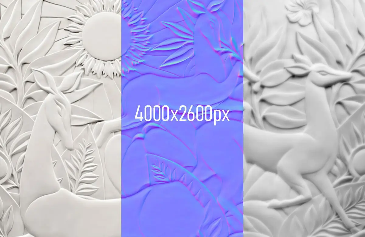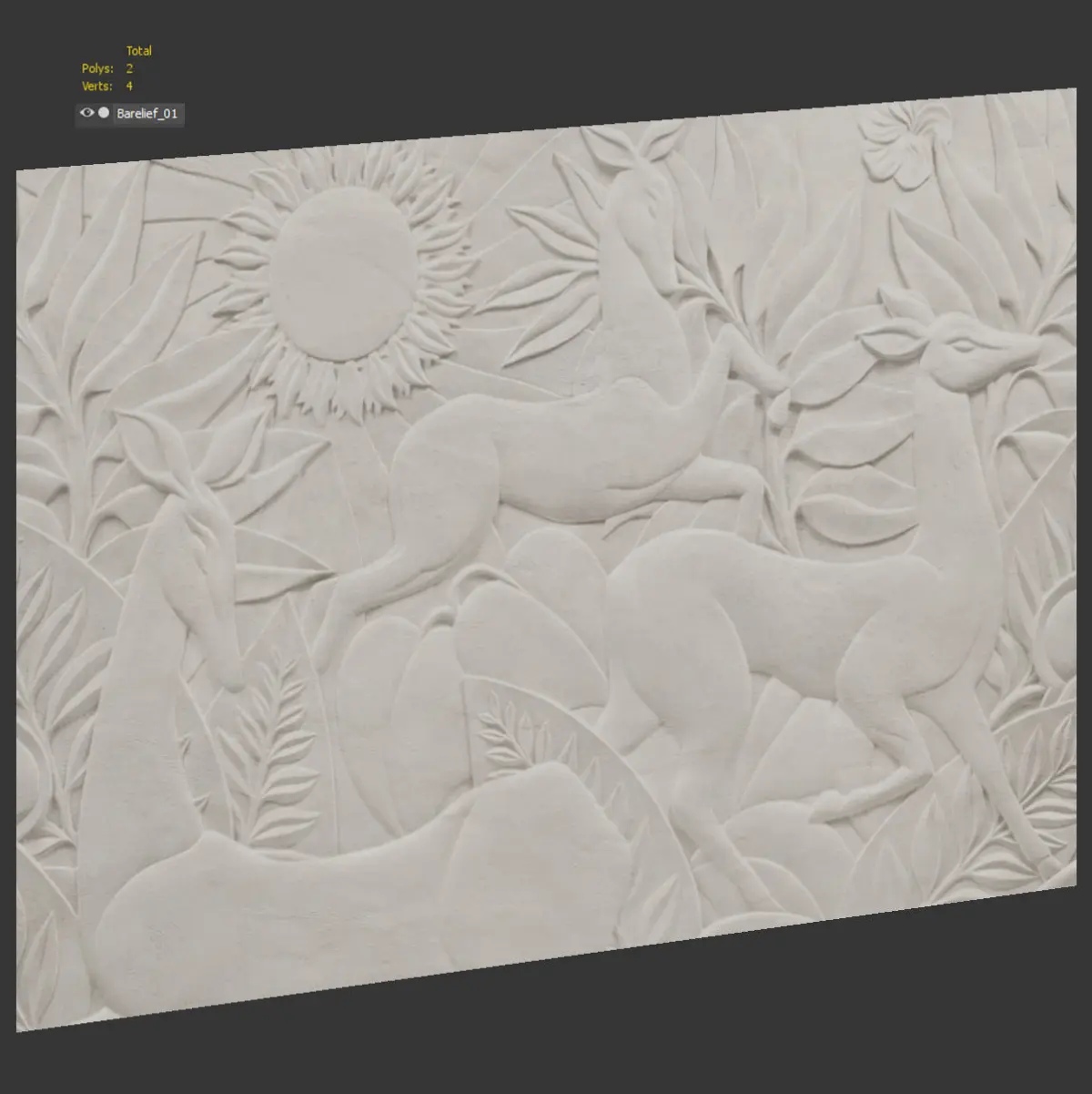 A bas-relief with deer and plants. Made with diffuse map, displace map, normal map