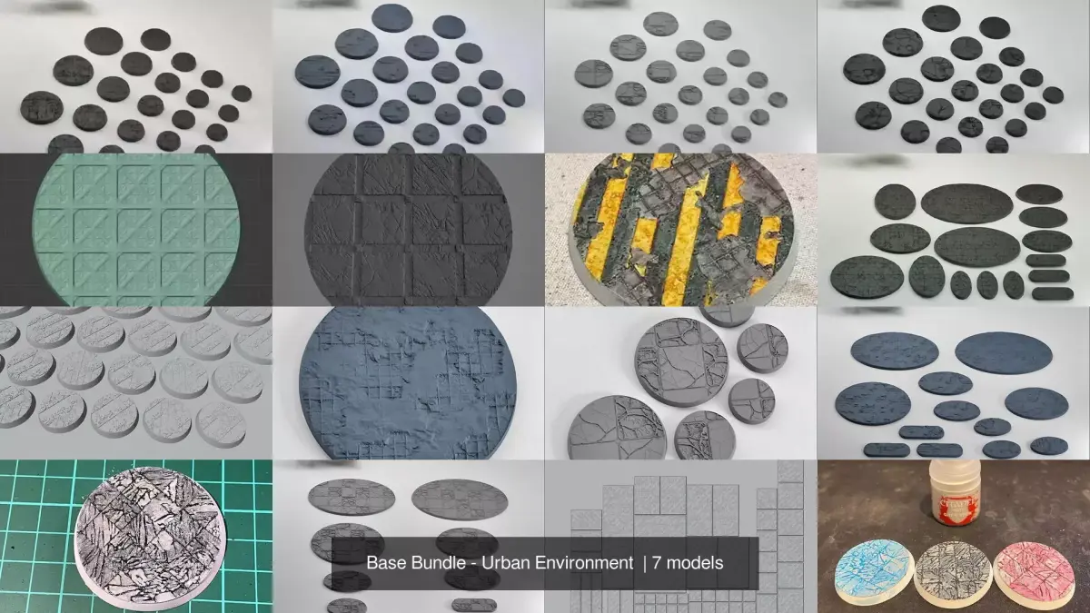 This bundle brings together 7 distinct Urban themed base sets, designed to provide a gritty, realistic foundation for your miniatures. Whether your forces are advancing through shattered city streets, grand marble plazas, or industrial docking bays, this collection offers high-detail textures to suit various urban combat zones.