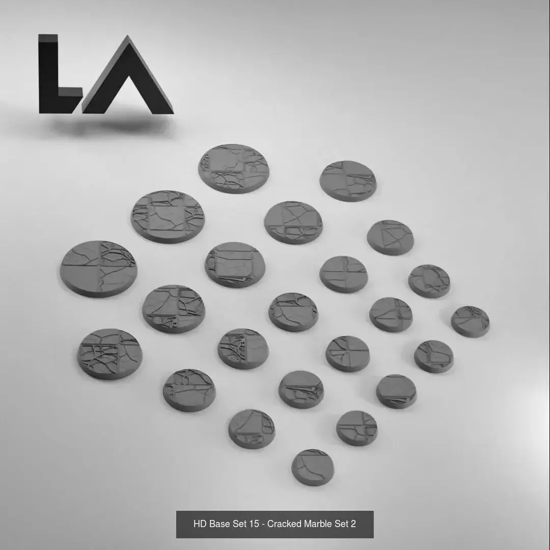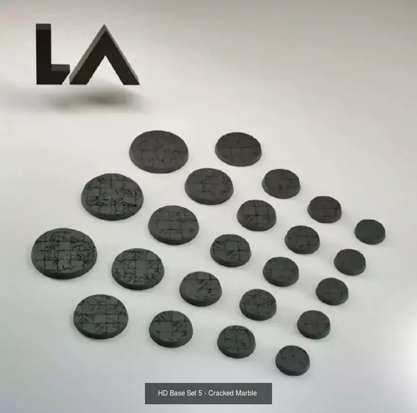HD Set 19 (Large Marble Tiles): * Rounds: Focused on character and vehicle sizes, including 32mm, 40mm, 50mm, 60mm, and 100mm.