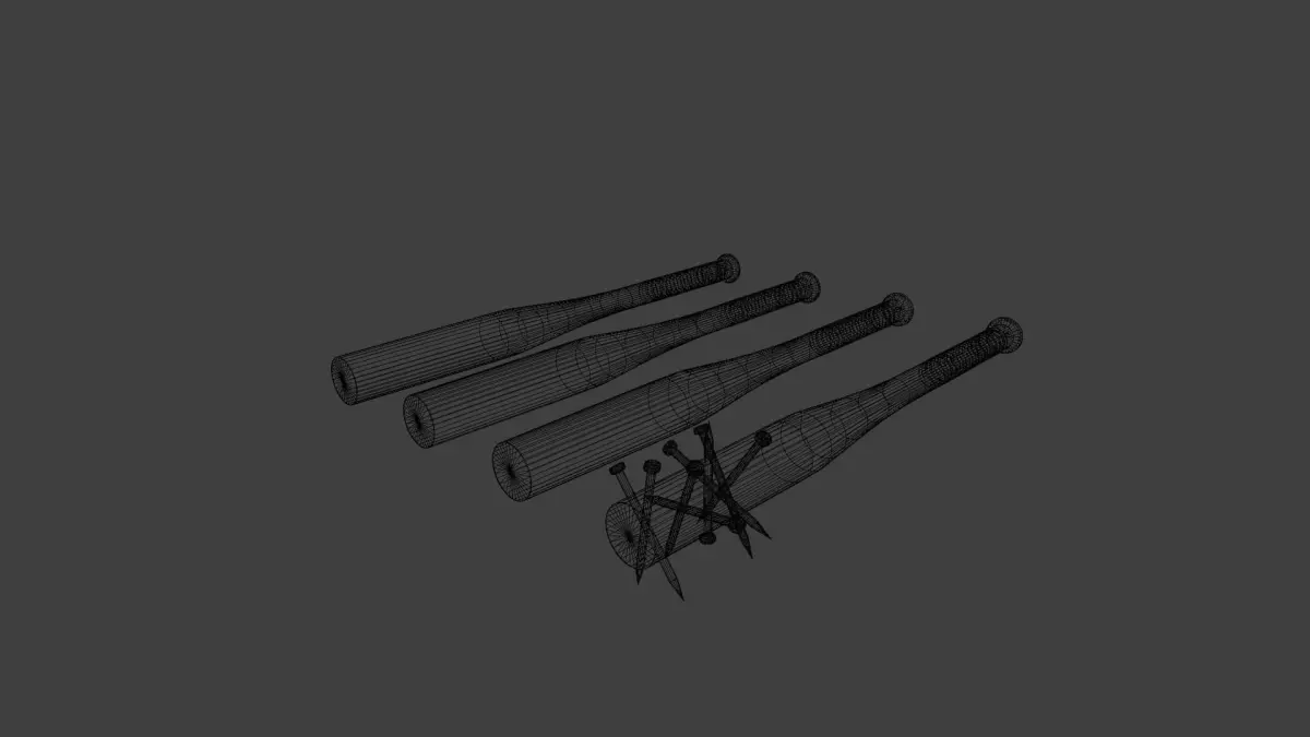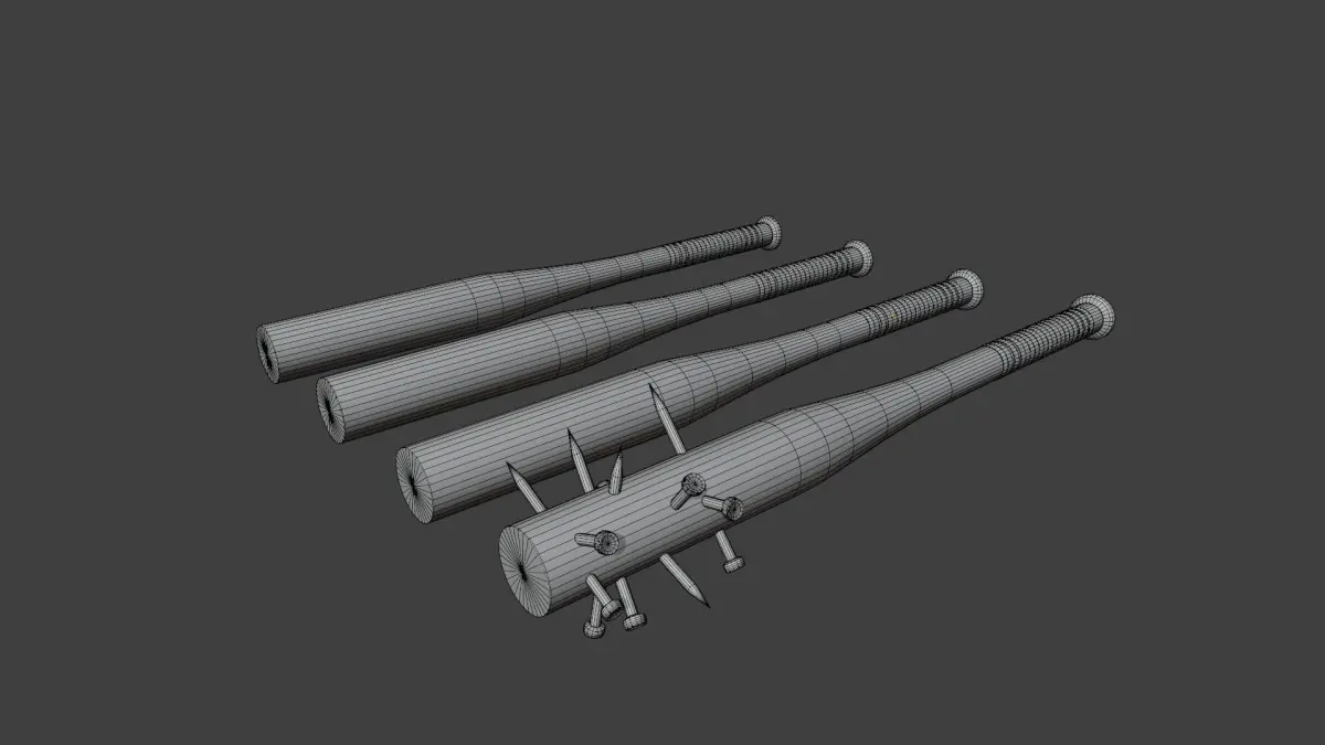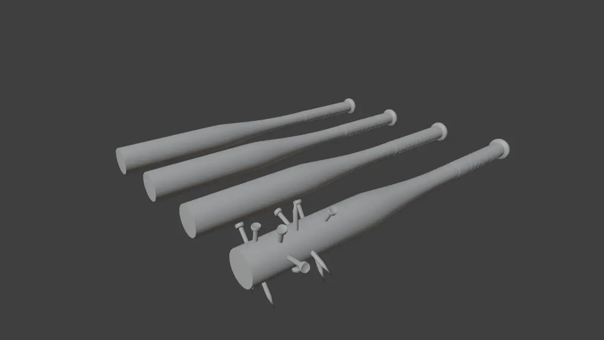 A classic wooden baseball bat, a metal/silver baseball bat, a gold baseball bat and a wooden baseball bat with bloody nails