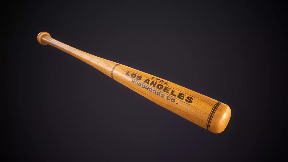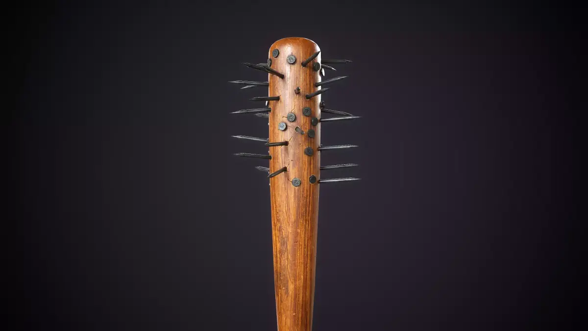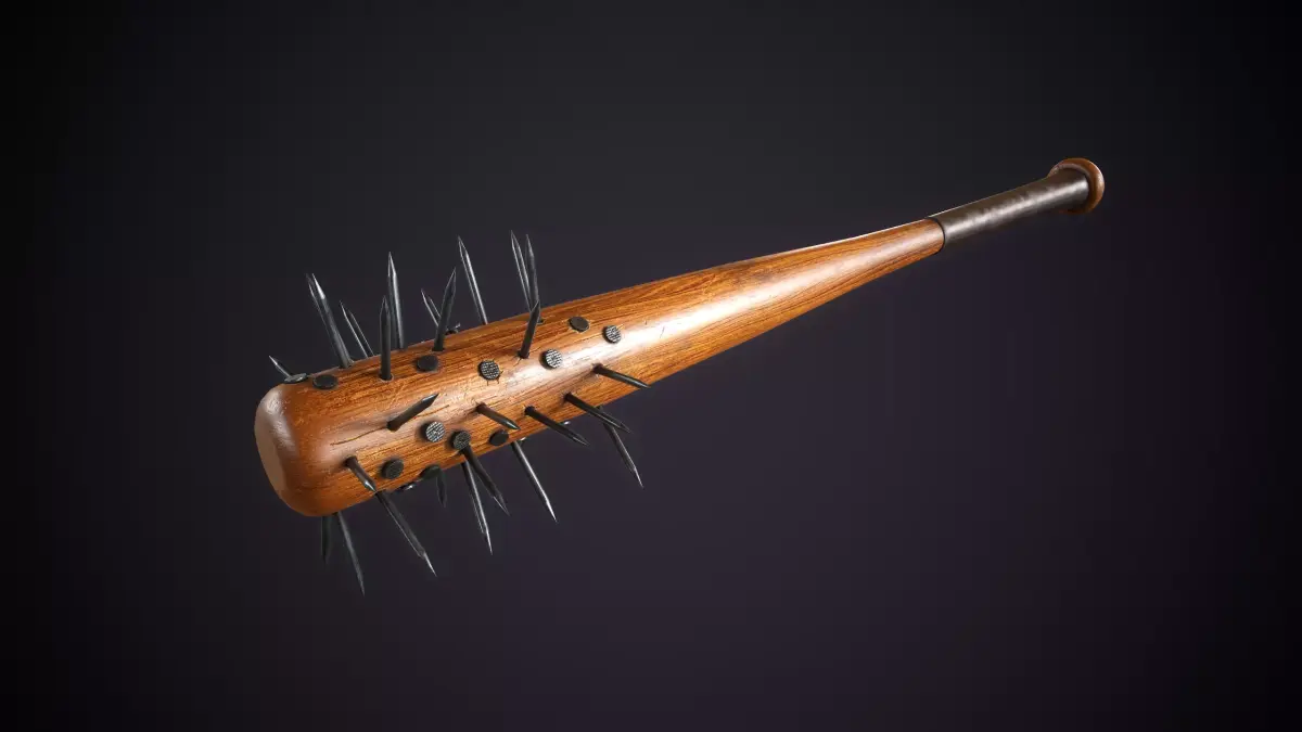 A collection featuring three distinct baseball bat variations: a classic polished wooden bat, a brutal wooden bat modified with nails, and a scratched aluminum bat.