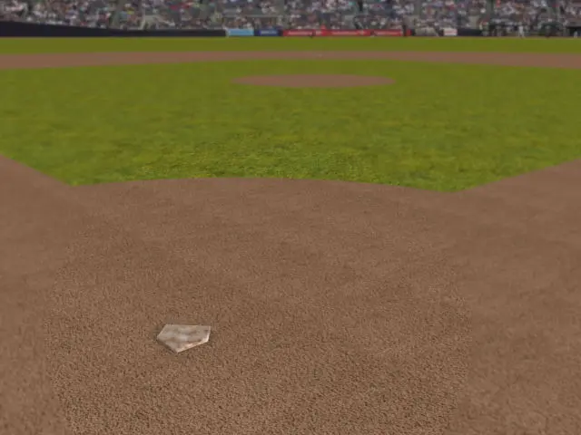 The baseball field is mapped with UV map (using the texture field.jpg). It's good for aerial view.Even if that texture is big, it isn't bigger enough for scene near the soil. I provide in the ZIP the texture for use a procedural mapping as show in the image 15th and 16th:the texture grass.jpg and grass2.jpg for the grass and the clay.jpg for the clay court.For use the procedural mapping you have to map manually the texture on the materials.