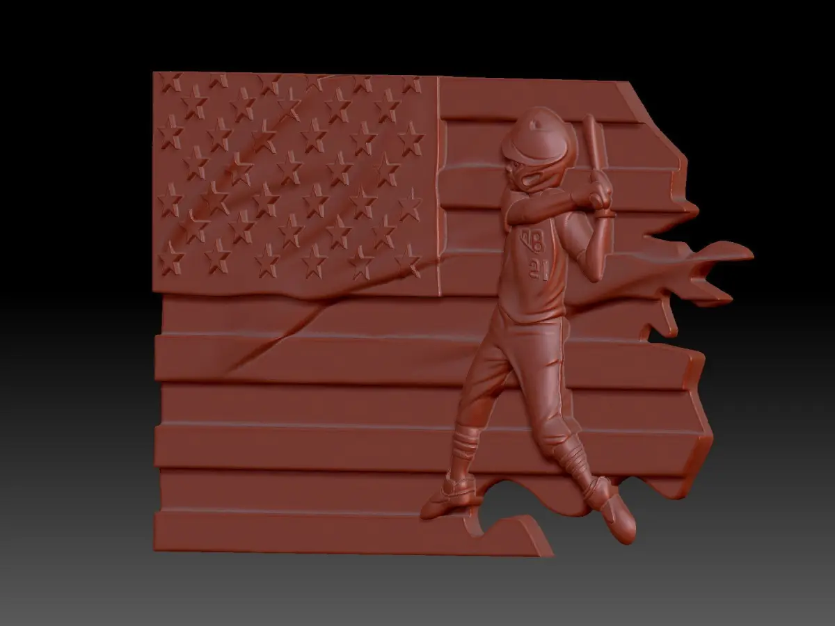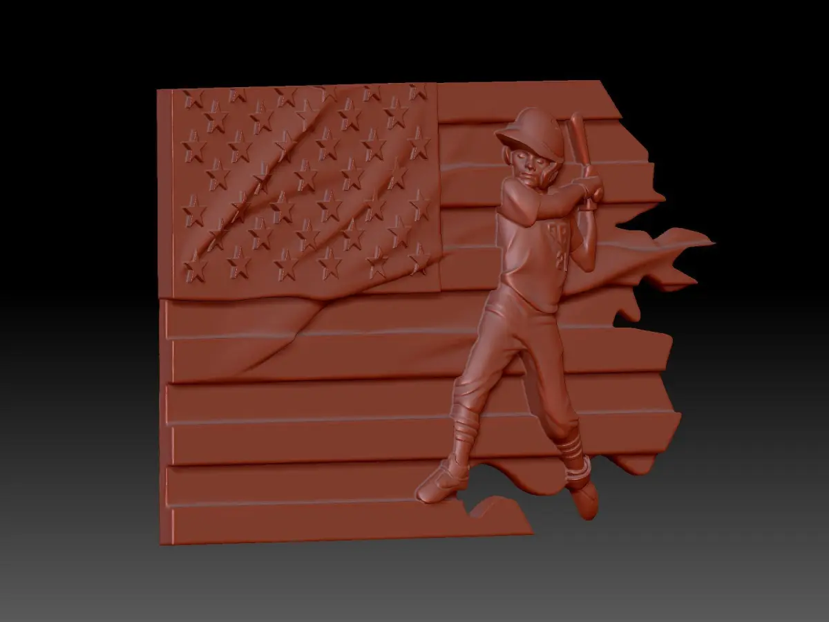 The 3D model of the bas-relief called Baseball Player is a realistic image of an athlete hitting an opponent. The American flag is flying in the background, creating an atmosphere of patriotism and pride. This project is ideally suited for 3D printing and processing on a numerical control machine (CNC).
