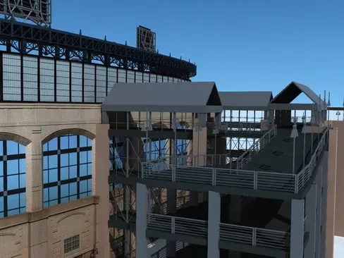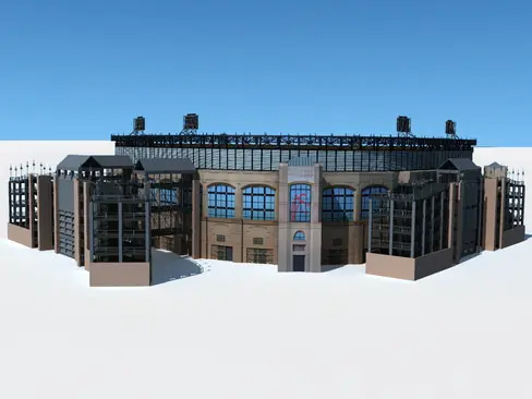 Complete high detail baseball stadium, exterior and interior with tribunes, seats, displays, roof construction and advertisement-boards.
