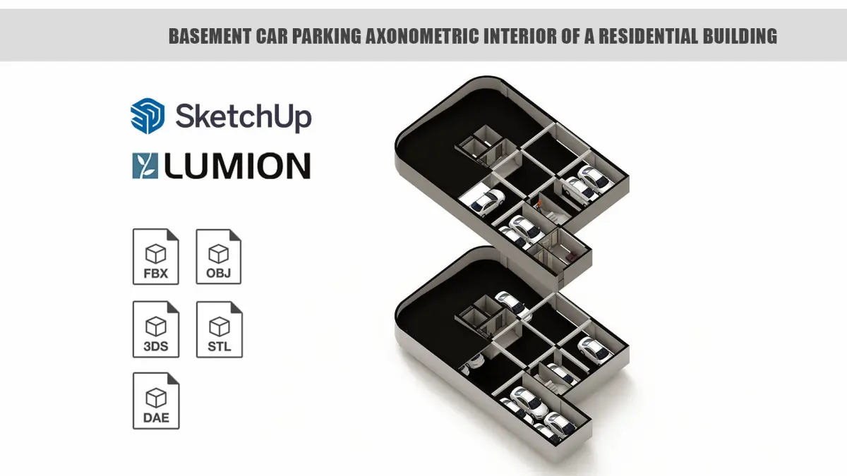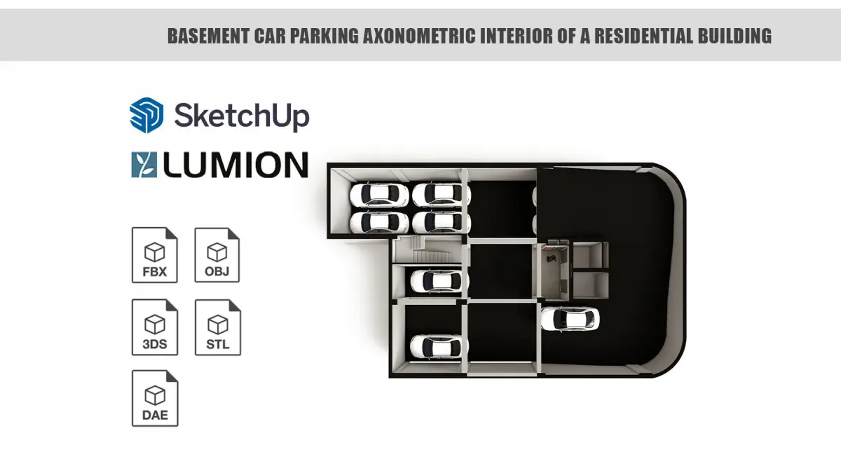 Basement Car parking axonometric interior inside a Residential building with a parking space for 14 private cars. The isometric Model was designed in Sketchup 2021 and is fully textured. No cleaning up is required, you can drop skp model into your scene and start rendering. All render settings are easy to use, copy and paste. No special plugin needed to open scenes. Both upper and lower basement vehicle parking are available with waiting zone for drivers.