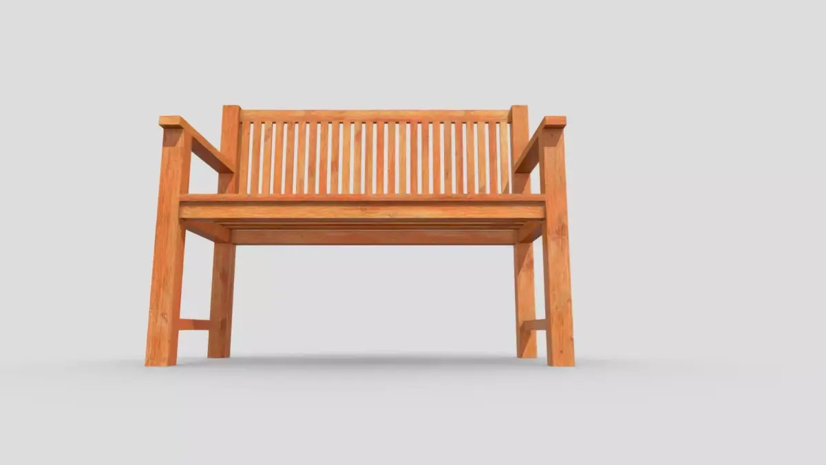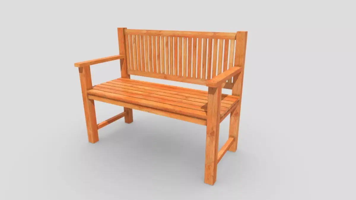 This is a sturdy wooden bench with a slatted seat and backrest, complemented by armrests on both sides. Its natural wood finish makes it ideal for outdoor or garden use.