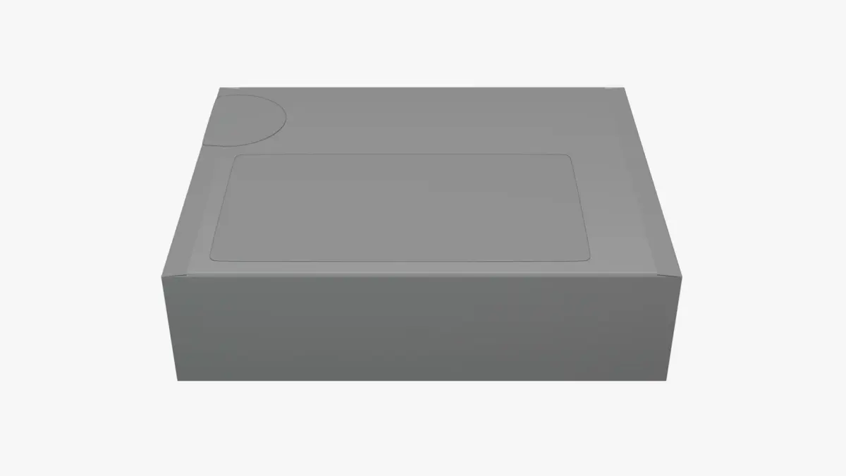 A versatile 3D model of a box package featuring additional elements like a circle sticker and a rectangular sticker. Suitable for packaging and branding presentations.