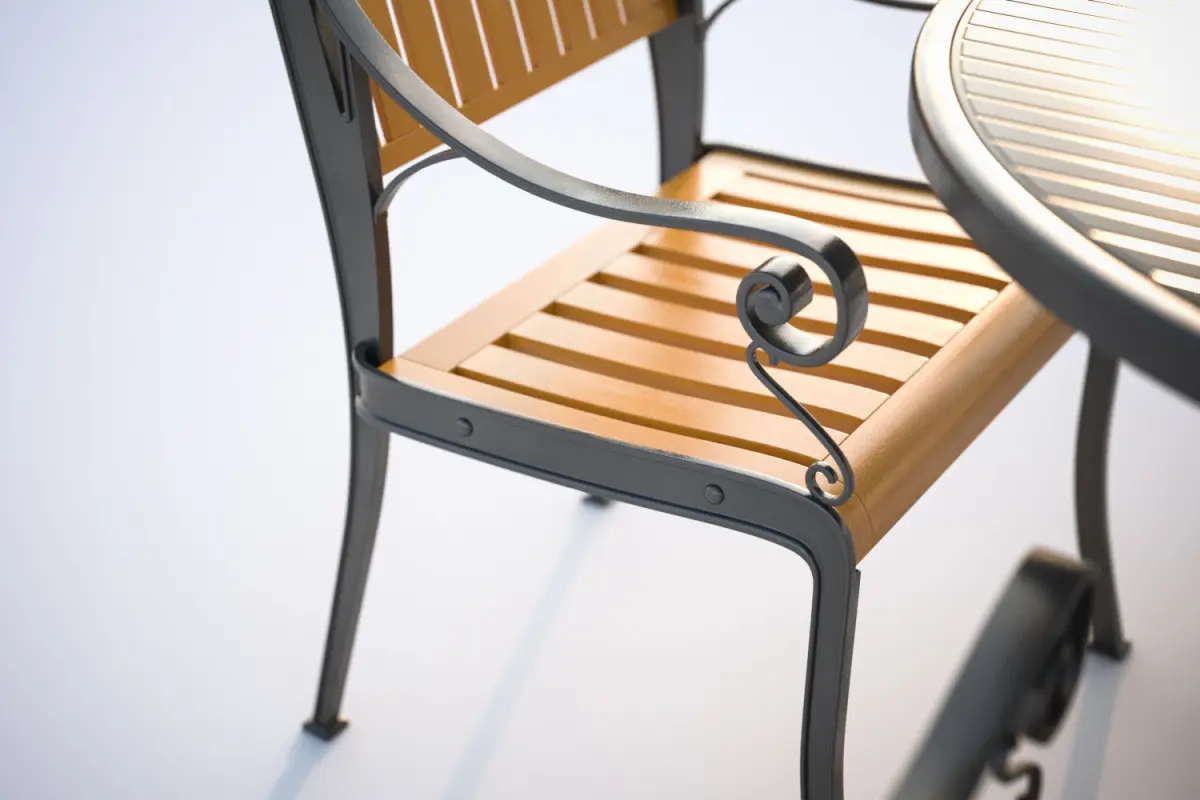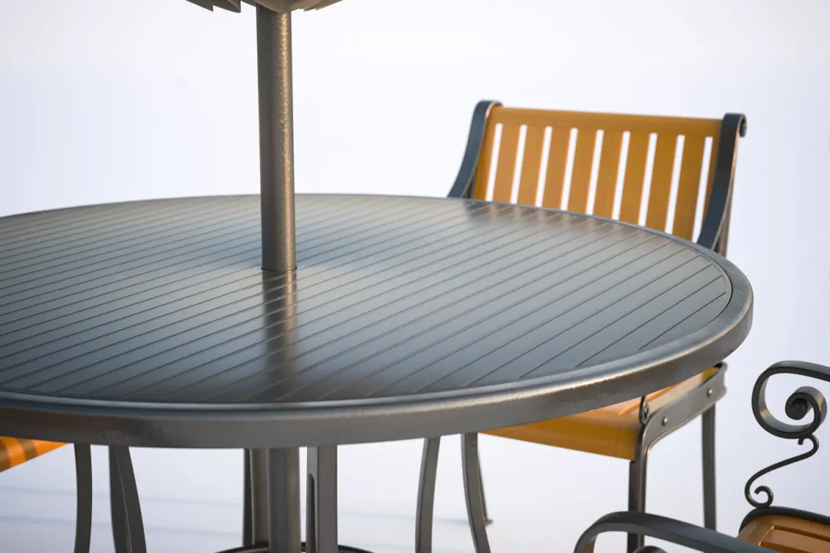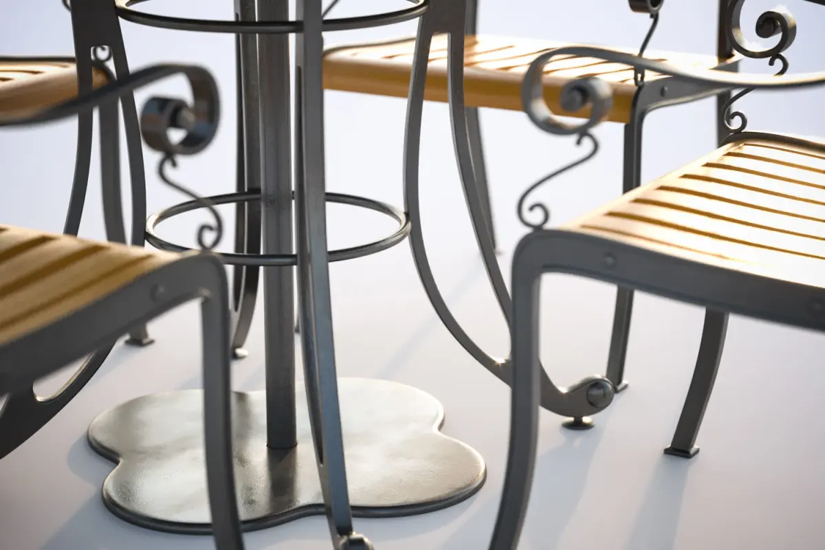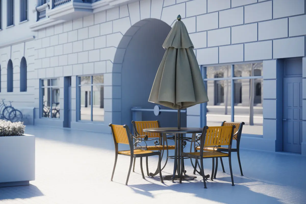This high quality set includes four basic chairs placed on the street. In the center is a table with a folded umbrella.Model prepared for 3d architectural visualisations and other graphic works.