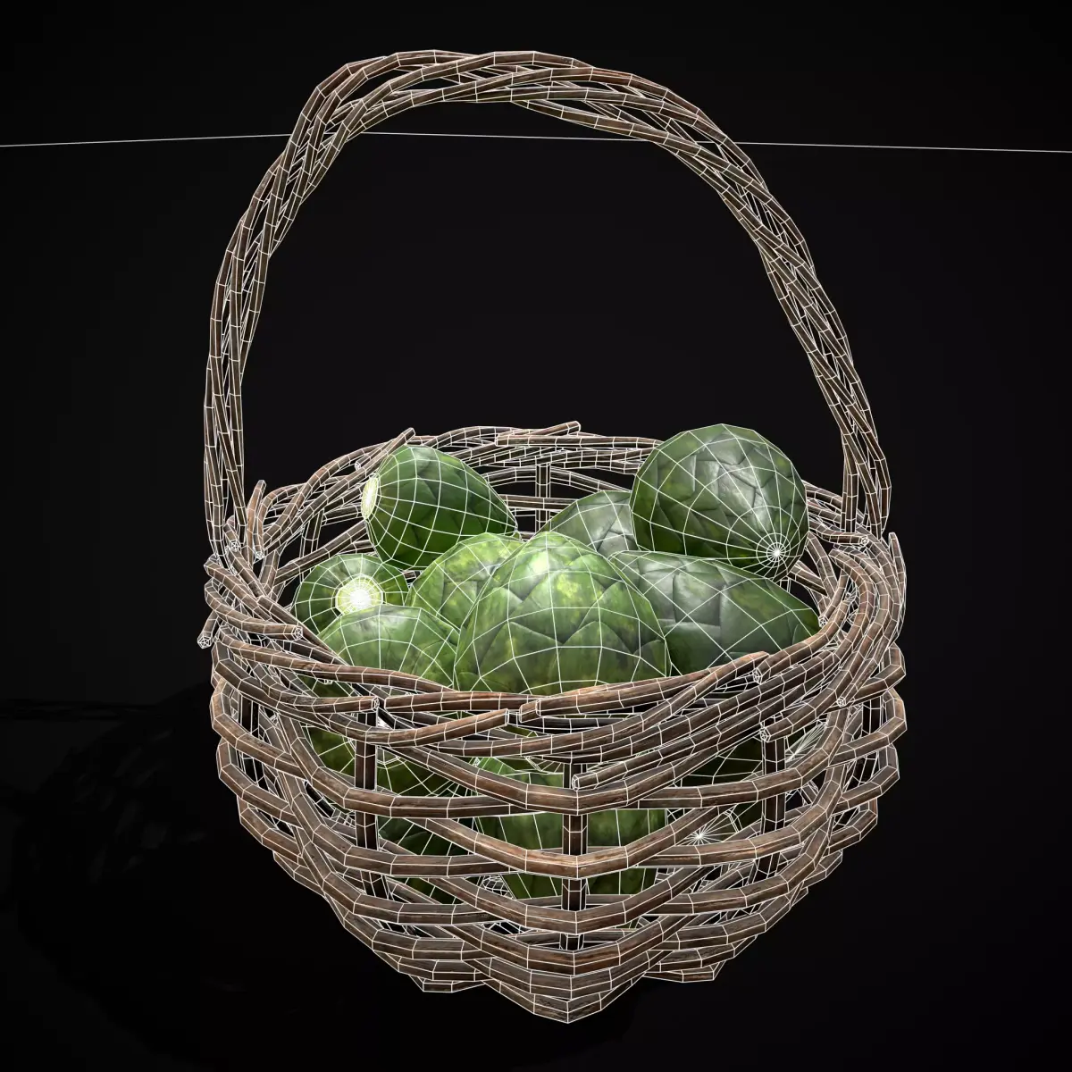 Basket of Artichokes - High Detail, Game Ready 3D Model - Files Include FBX and OBJ. Includes PBR Texture in 4096 x 4096. All Models share one Material. Maps include : Basecolor, Normal, Roughness, Height, and Metallic. All Preview renders were done Marmoset Toolbag 5. Scaled to real world scale. Customer Service Guaranteed. From the Creators at Get Dead Entertainment. Please like and Rate! Follow us on FaceBook and Instagram to keep updated on all our newest models. Model can be used for any purpose except resale or redistribution of the asset if not used in a game, commercial or media project. Note: Artichokes and Basket each have their own Material.