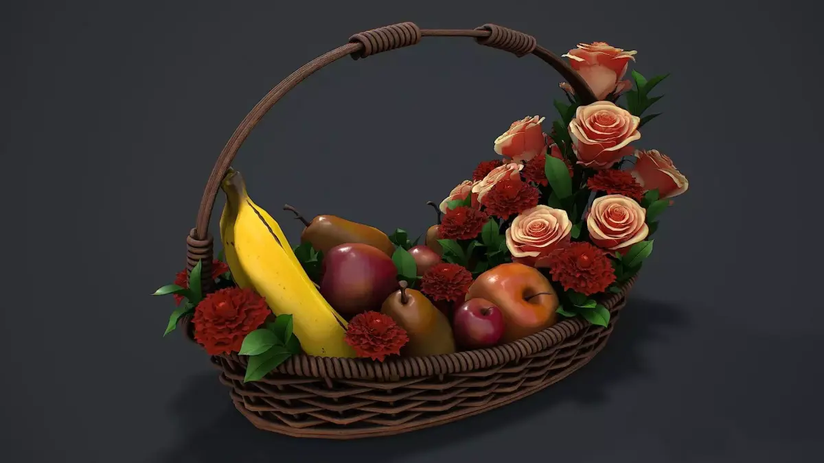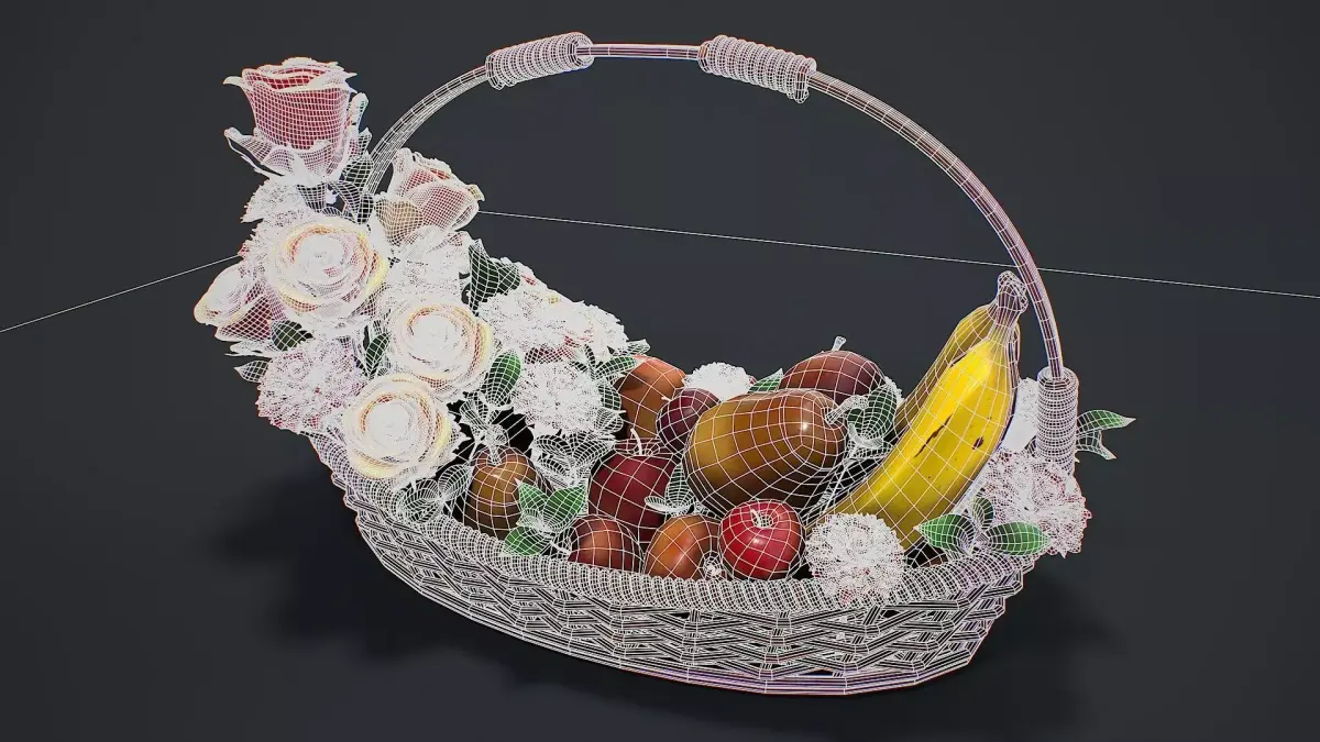 Hello. This is a high definition quality polygon of a Basket with flowers and fruits 3D Model with PBR textures. Extremely detailed and realistic. Suitable for movie prop, architectural visualizations, advertising renders, games, VR, AR and other. The archive includes Obj and FBX, Marmoset scene, Blender scene, HDRI, textures for the PBR: Base color, Metallic, Mixed AO, Normal_OpenGL, Roughness. And also included in the archive textures for UE: BaseColor, Normal, OcclusionRoughnessMetallic. All textures are 4K resolution. The model contains 1 object: Basket