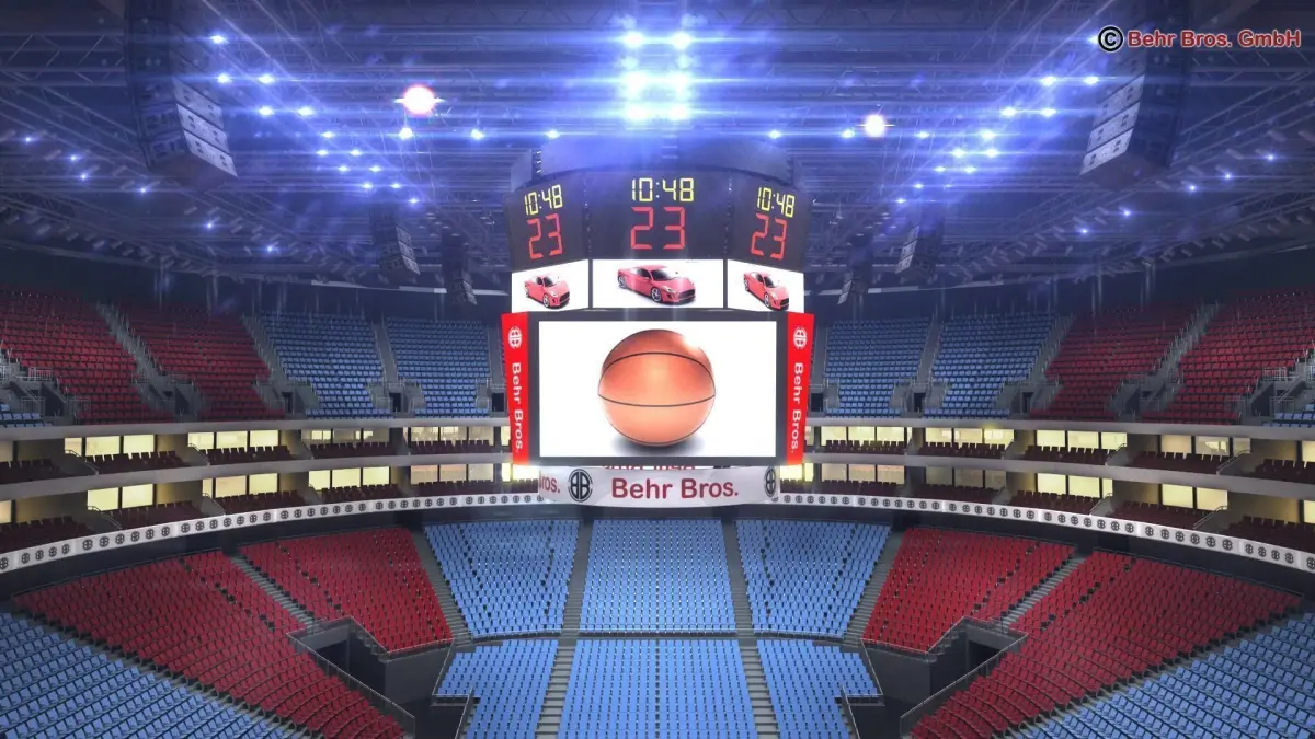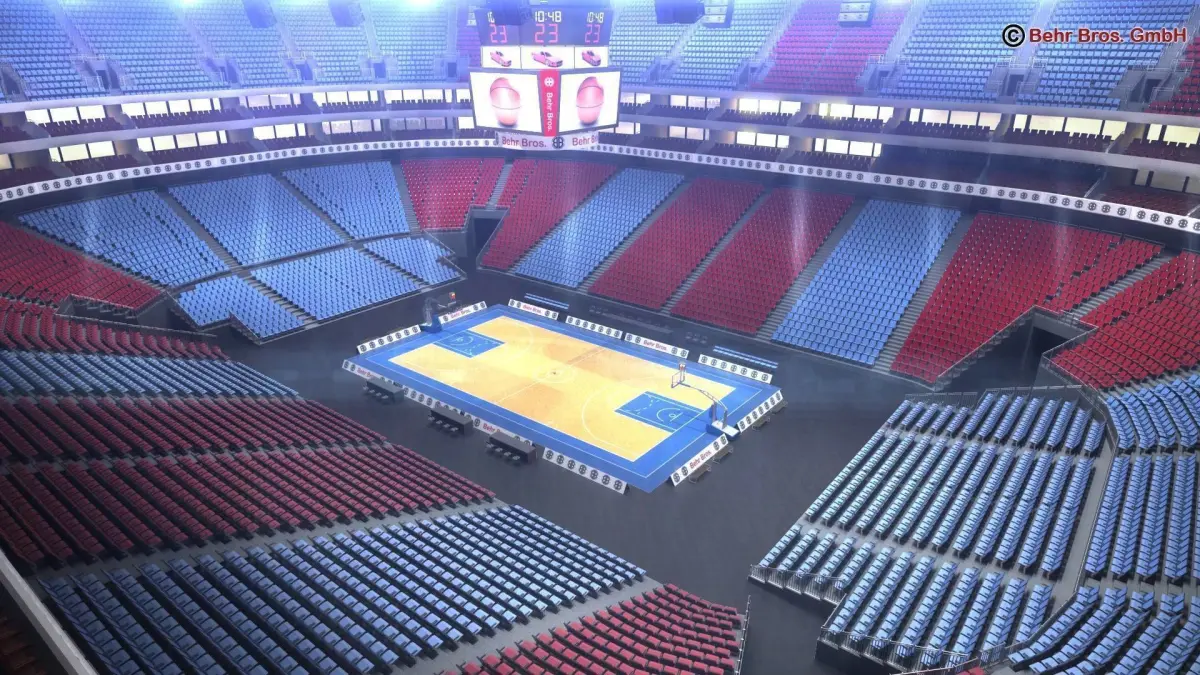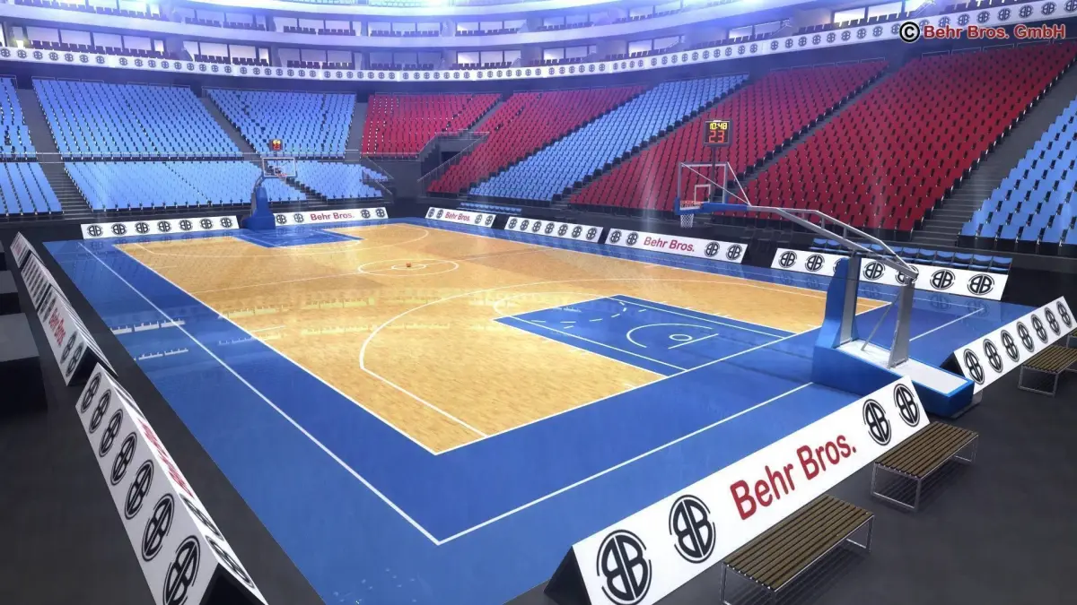 Basketball-arena with tribunes, seats, tables, detailed backstops, display, roof construction, advertisement-boards and ball. Textures for 3 different courts are included as tga, eps and Adobe Illustrator file.