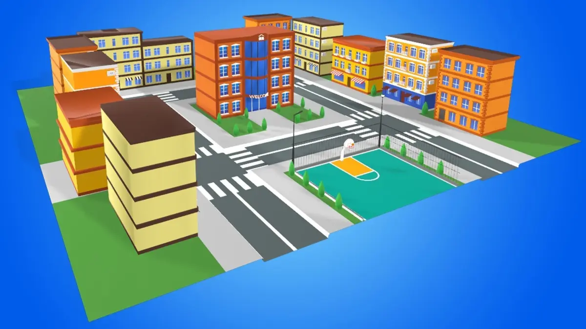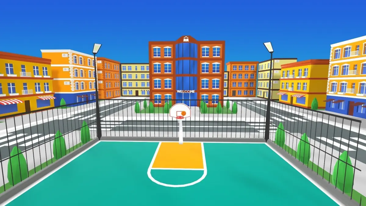 Stylized Low-Poly Scene of 3D Basketball Court in Urban Environment, perfect for mobile/web Basketball Game.