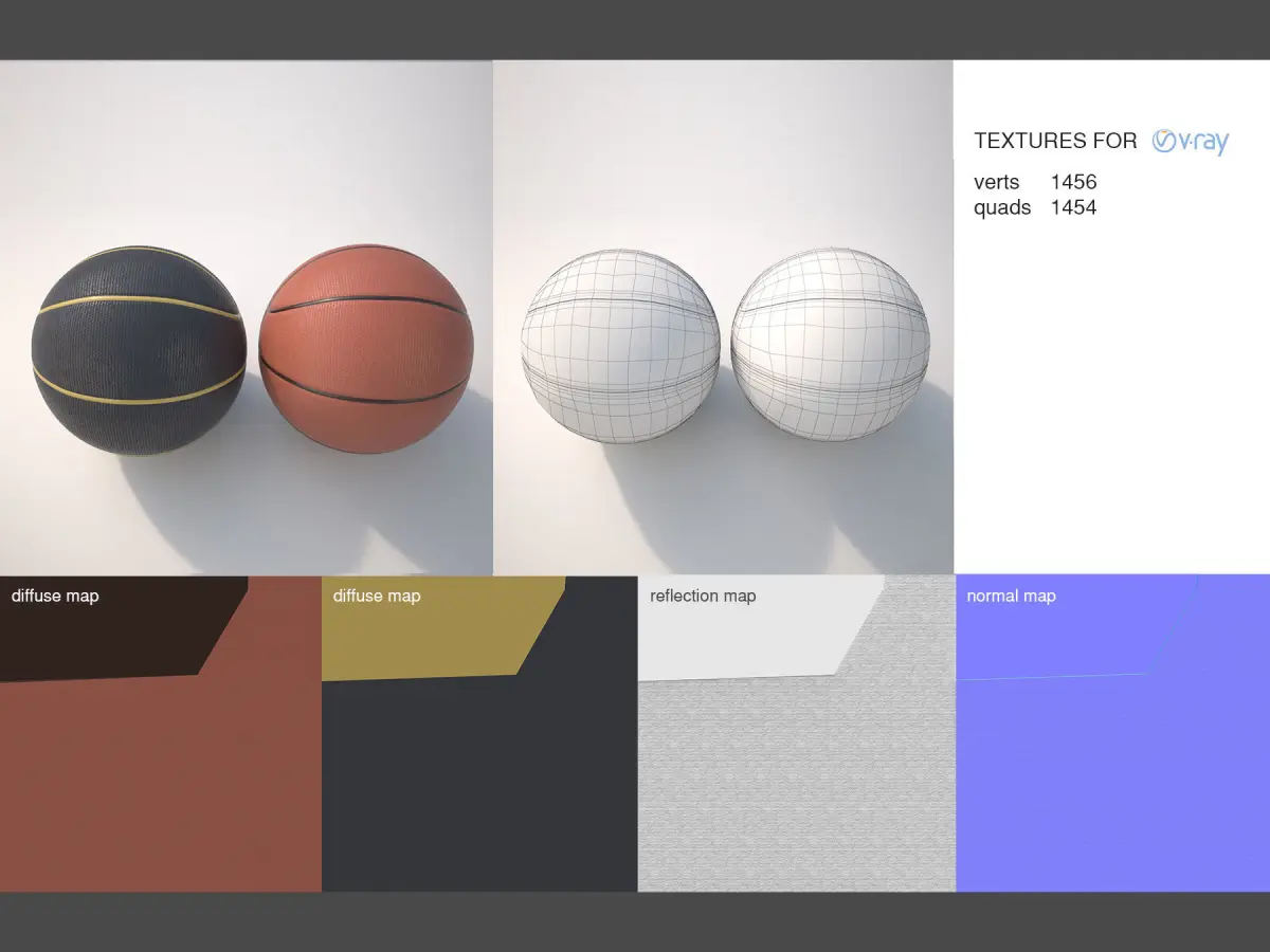 you get 2 badsketballs with PBR flattened textures for VRay Standard Material (VRayMtl) for 3ds max and maya.