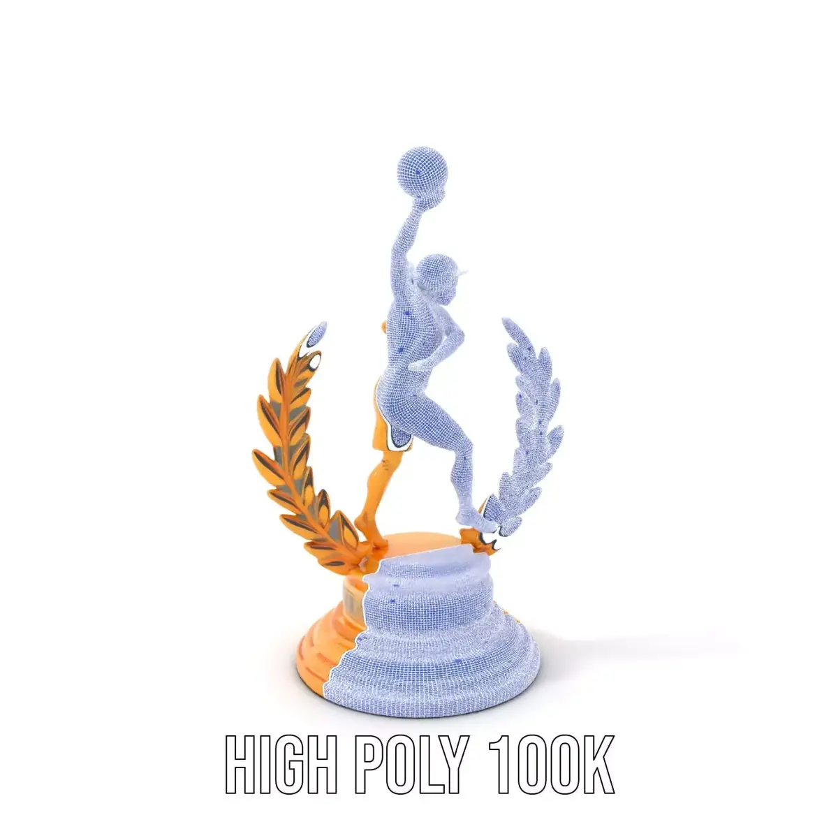 A detailed 3D model of a basketball trophy featuring a player with a ball, adorned with a laurel wreath, ideal for sports-themed designs and presentations. Each model has 3 levels of detail: low-poly (1000 triangles for mobile), middle-poly (10,000 triangles for environment), and high-poly (100,000 triangles), which allows for the use of this model in production rendering (such as 3ds Max, Maya, Cinema4D, Blender, Vray/Corona/Cycles, and all other), game engines (Unity and Unreal compatible), and interactive presentations, providing a choice of detail based on the LOD System principle. This model can be used in sports game design, trophy presentation animations, or virtual sports awards shows. The model's textures are PBR, Diffuse, NormalMap, and reflection/roughness/metallic, which are suitable for any modern rendering engine. All models accurately unwrapped and have no overlapping UV. All textures are 4096*4096 in size. The first image is the reference used for creating the 3D model. It is important to carefully evaluate the quality of the model by examining the preview images that display the topology and polygonal mesh. These previews (WIRE and WEB 3D Preview) clearly demonstrate how accurately the model matches the original reference and how well the geometry has been executed. Please like and leave a comment if you enjoyed this model.