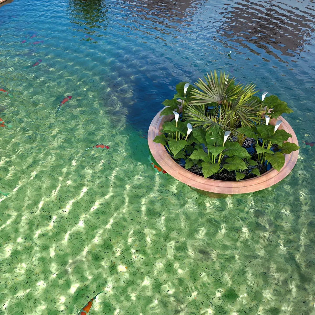 Garden pond with Koi fishs and aquatic plants. Size : 10 x 10 m