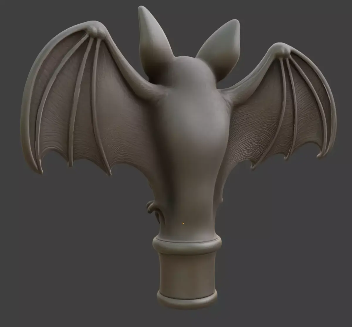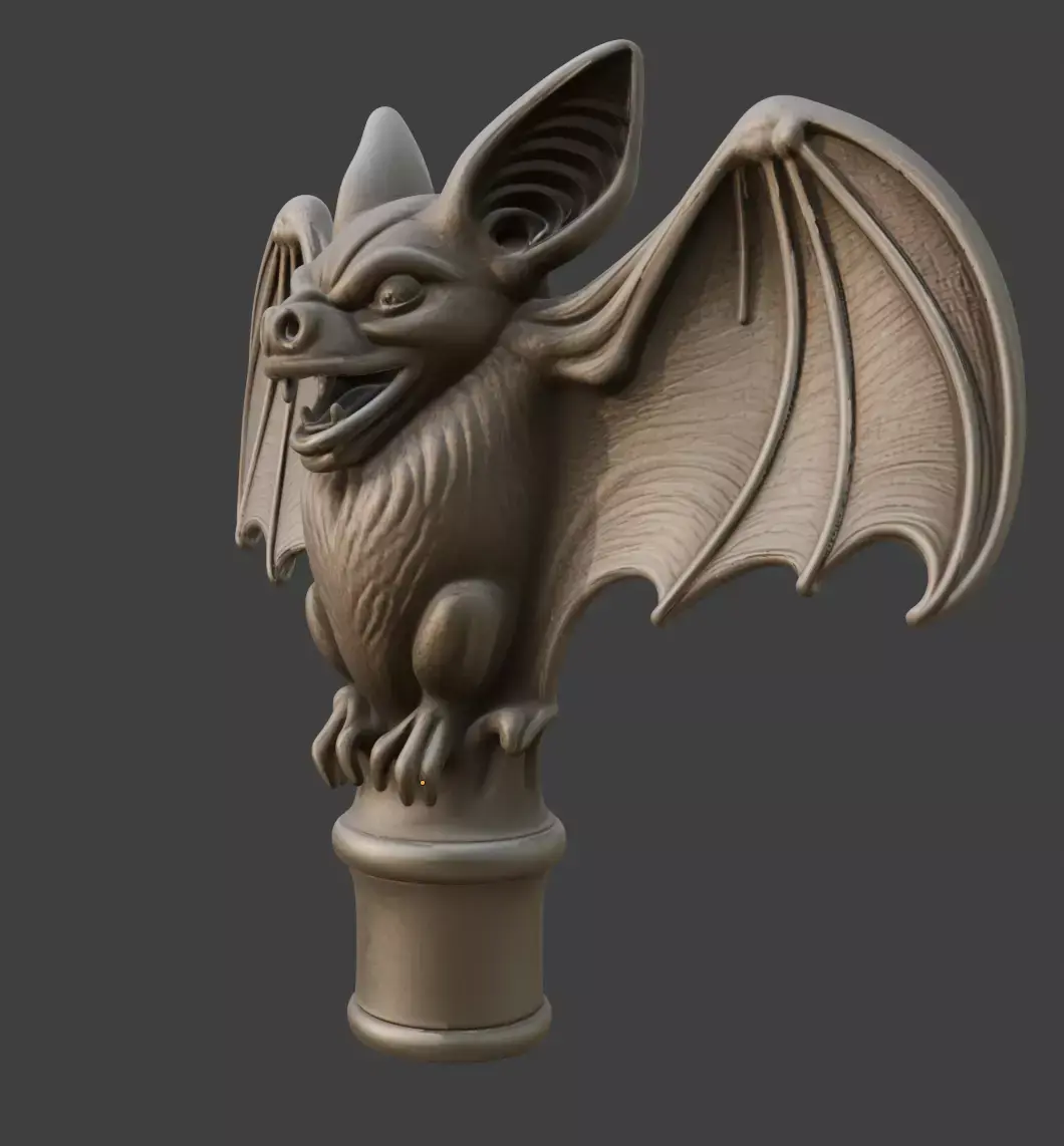 A dramatic cane topper shaped like a bat in flight, with outstretched wings and carved detail. Ideal for gothic fashion, Halloween costumes, vampire-themed characters, or collectors of dark fantasy props.