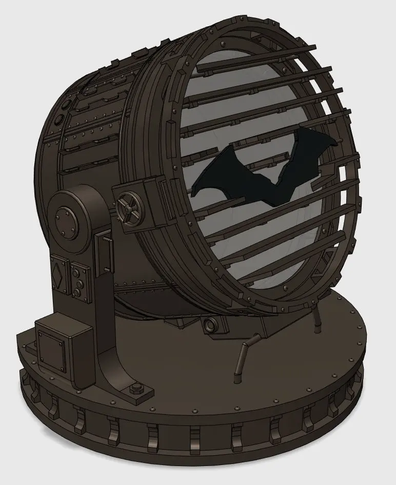 The Bat Signal From the Batman. The Signal is about 9 inches wide and 9 inches tall and the Lens is 6 inches wide.There are many ways to add light to this signal. the model has 3 versions to the led disc inside including, 5mm led, 20mm star base led and a blank disc to do your own thing.Has a Hole for a 20mm 1/2 inch opening push putton switch.All pieces fit nicely and is print ready.