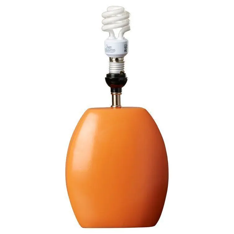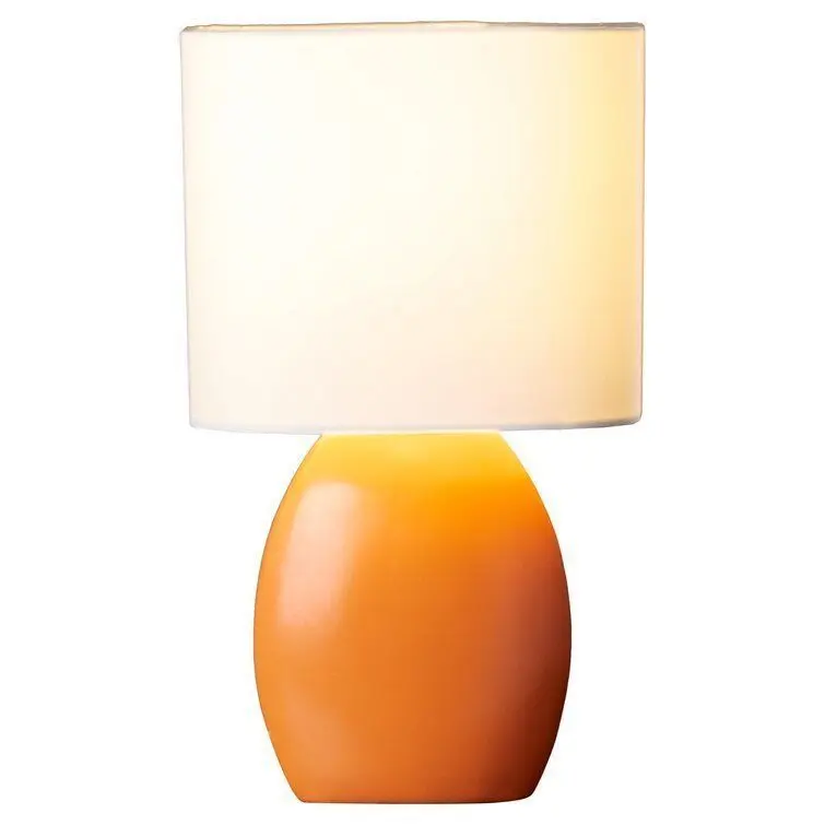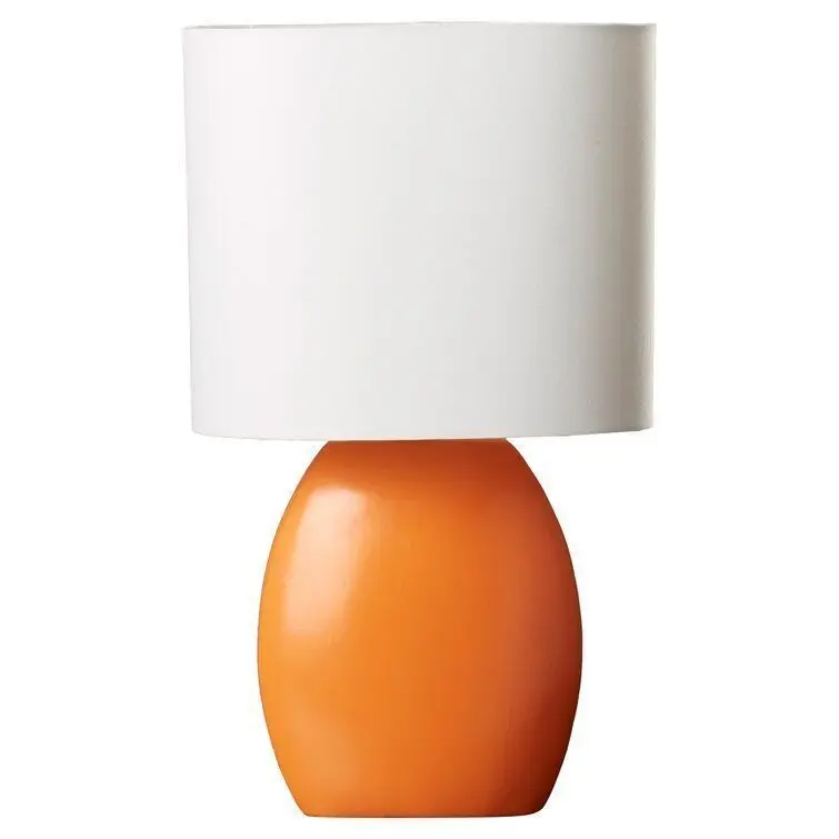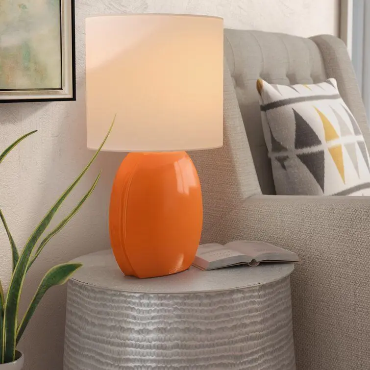 - This 17" H Table Lamp with Drum Shade is an attractive and functional lighting addition to a room. The white, drum-shaped fabric shade and the orange base of the table lamp creates a visually pleasing contrast. It is an excellent enhancement for a transitional style room decor.