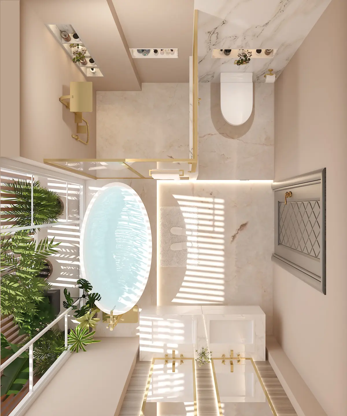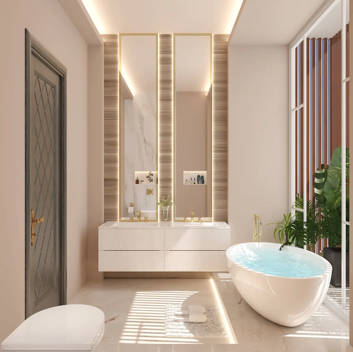 The spacious master bathroom exudes luxury and serenity, featuring a sleek and modern design. The room is anchored by a stunning bath tub, perfect for relaxing soaks, nestled beside a large window that allows natural light to pour in. Adjacent to the tub, a spacious shower cabin with glass doors and a rainfall showerhead offers a rejuvenating experience.