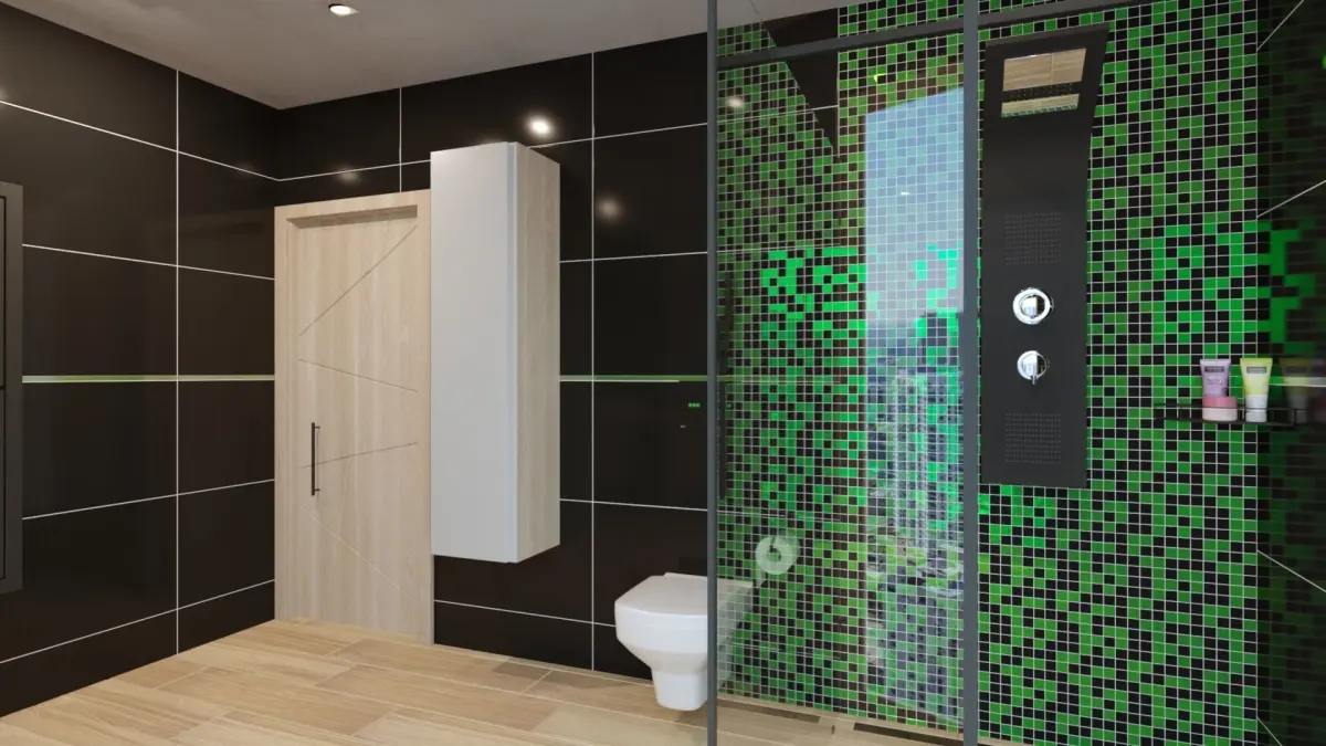 There is big and comfortable shower with open entry. Shower panel has control for head and hand shower, and water control. These are made via textures.