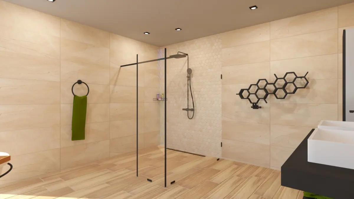 There is also towel radiator in very modern hexagonal style to match mosaic tiles.