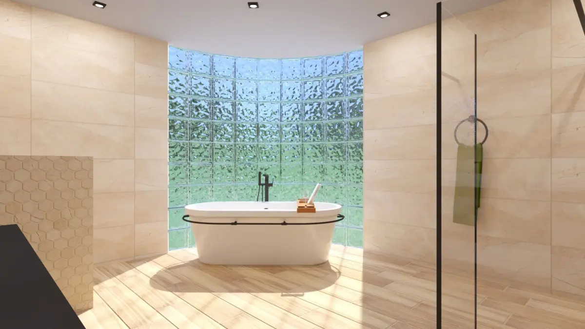 Centerpeice is big comfortable bathtub standing in front of glass wall.