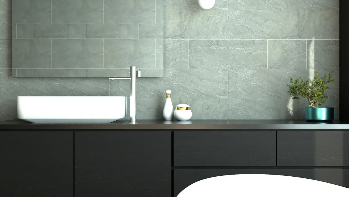 Modern bathroom with a view on the sea.