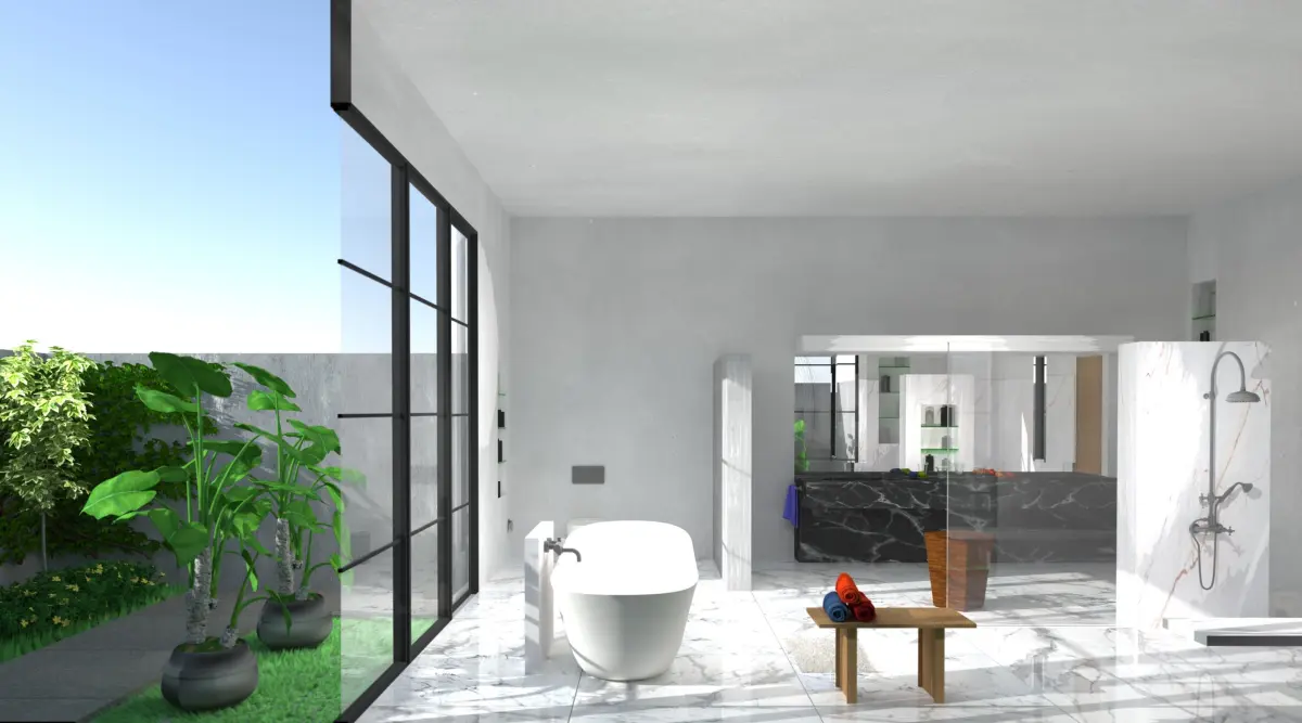 It is a bathroom with a freestanding bathtub, and has transparent glass doors that open to an outdoor garden. The shower is also surrounded by glass partitions, and has benches beside it and inside it. The tiles are made of marble statuario material. The tiles on the floor are placed in a grid pattern. The outdoor garden, has potted plants, a patio, and a walkway of rectangular tiles on the dirt and grass. It also has a toilet.