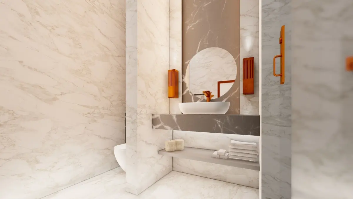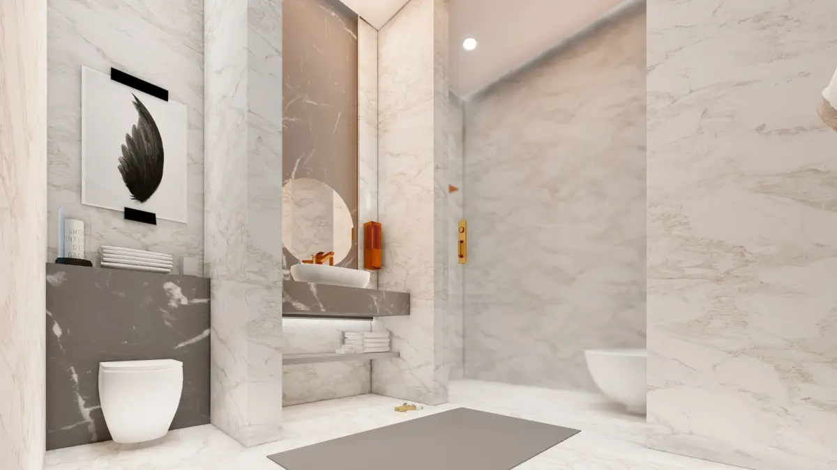 The bathroom of the house, 4.2 meters wide and 3.5 meters long, consists of bright granite materials that have an important appearance and make you feel warm and comfortable with an absolute shower from the shower. There is also a toilet with a modern and attractive design, with integrated bathroom coordination, integrated lighting, and unique creative work.