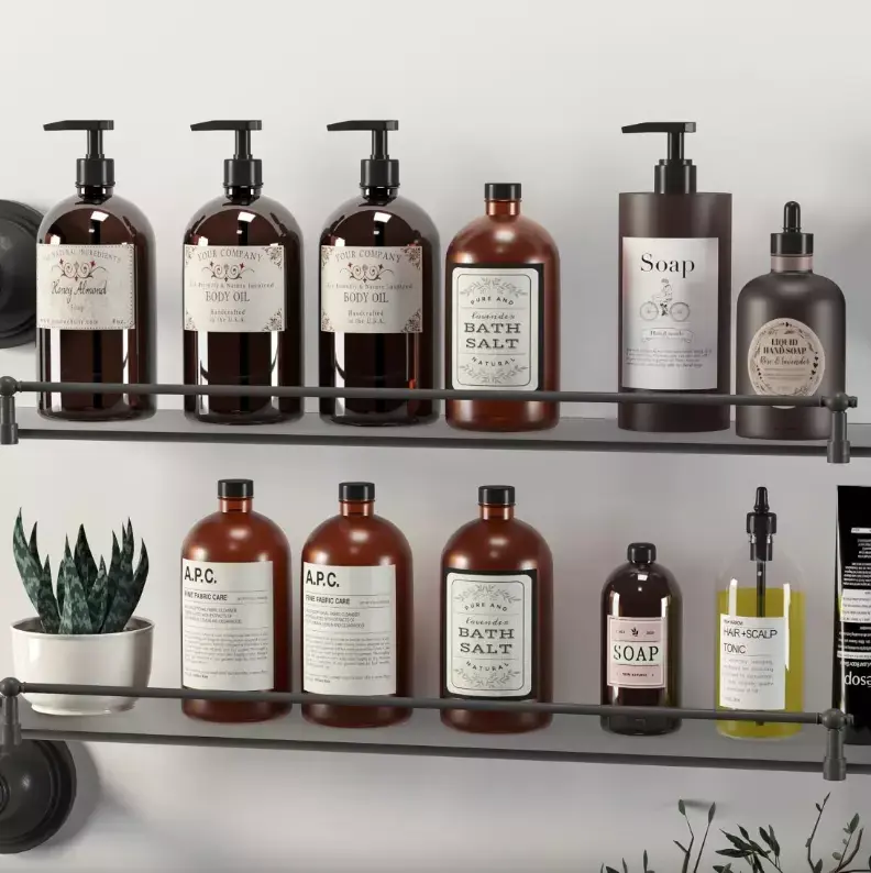 The scene includes various bathroom products—bottles, towels, candles, plants, and decor items—carefully arranged to enhance visual appeal and provide a ready-to-render setup. The model is optimized for architectural visualization, interior design presentations, product showcases, and high-resolution rendering projects.