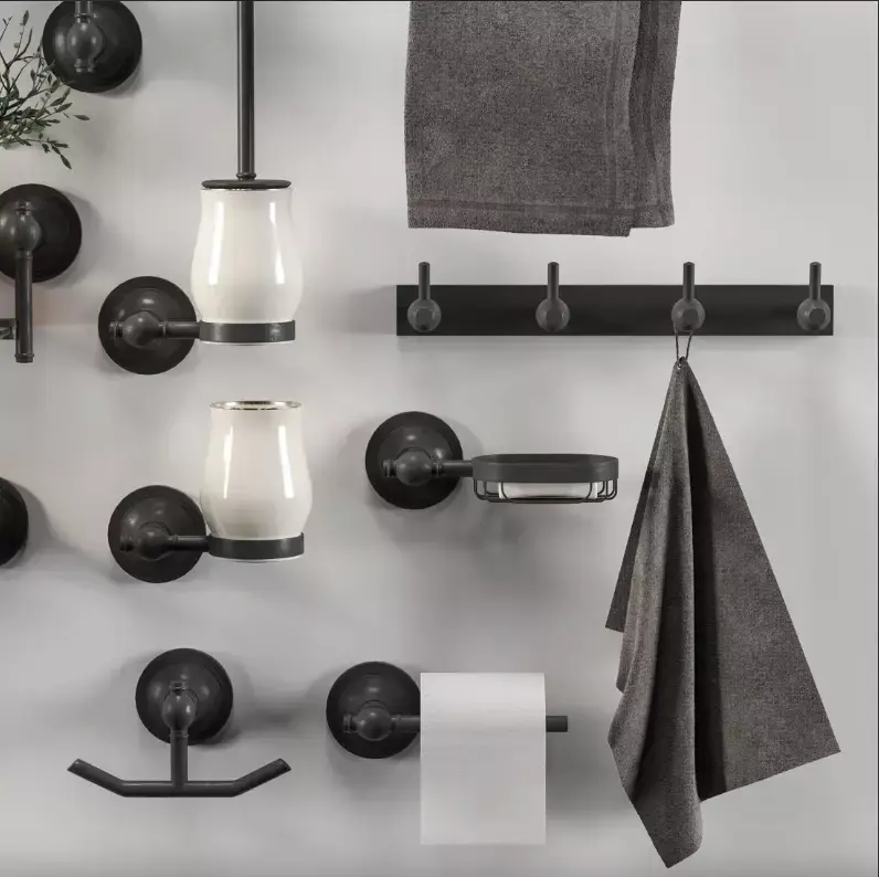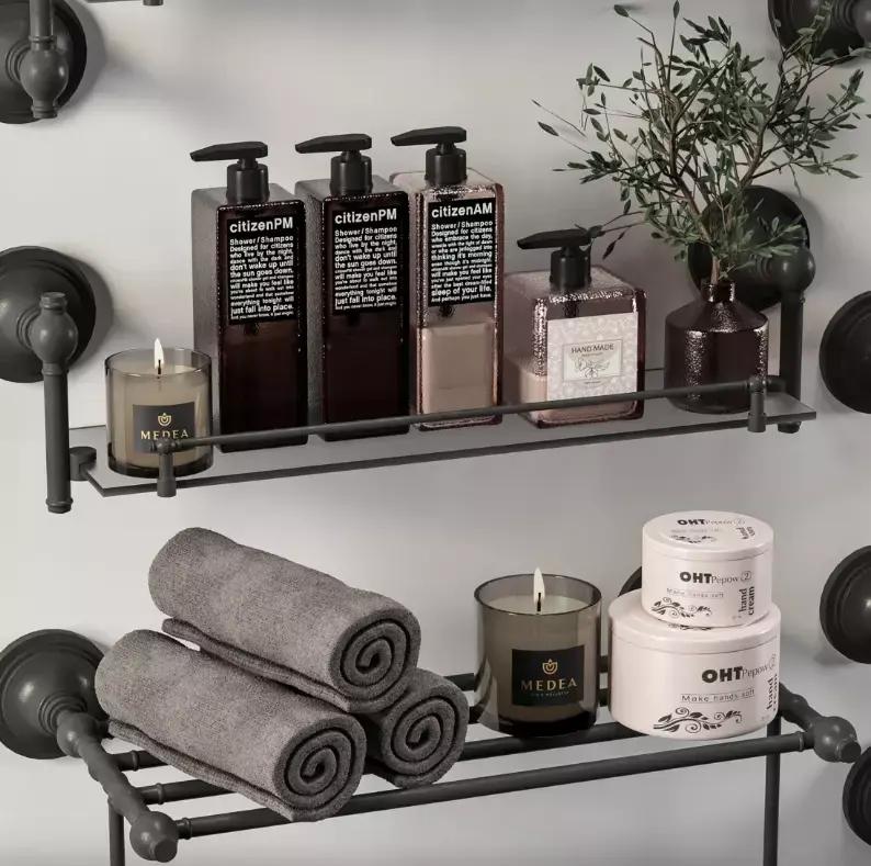This 3D model features a complete, high-quality collection of bathroom accessories designed in a modern industrial style. The set includes multiple wall-mounted elements such as towel bars, shelves, hooks, soap dispensers, tissue holders, and storage racks. Each item is crafted with detailed geometry and realistic materials, showcasing dark metal finishes and clean structural lines.